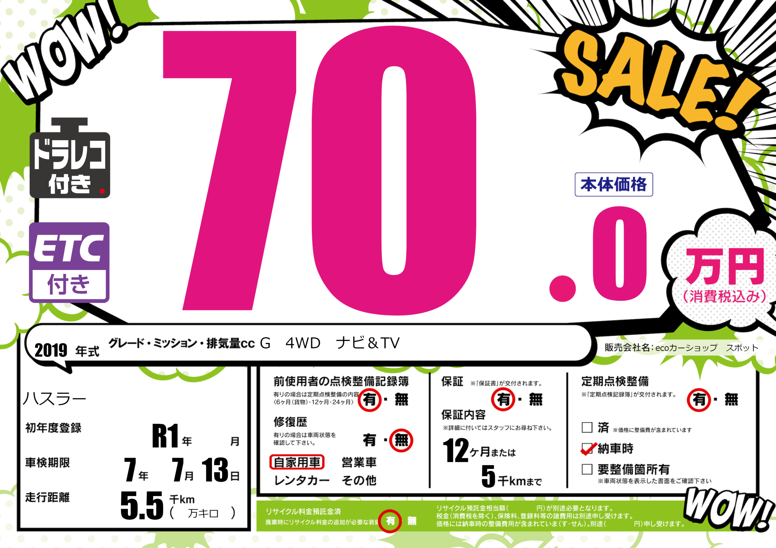 | 車名 | ハスラー | グレード ミッション 排気量 |
