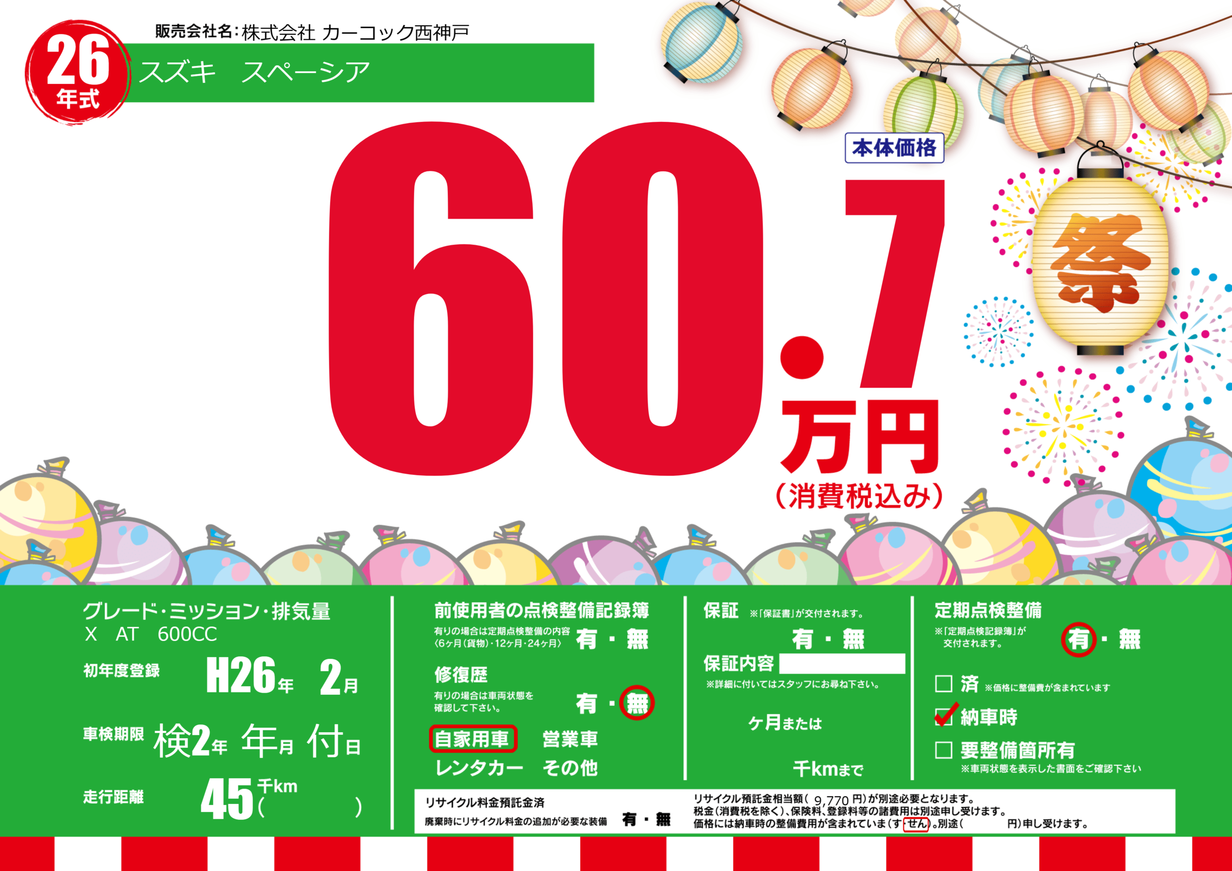 | 定期点検整備 | 定期点検整備あり 納車時あり | ||