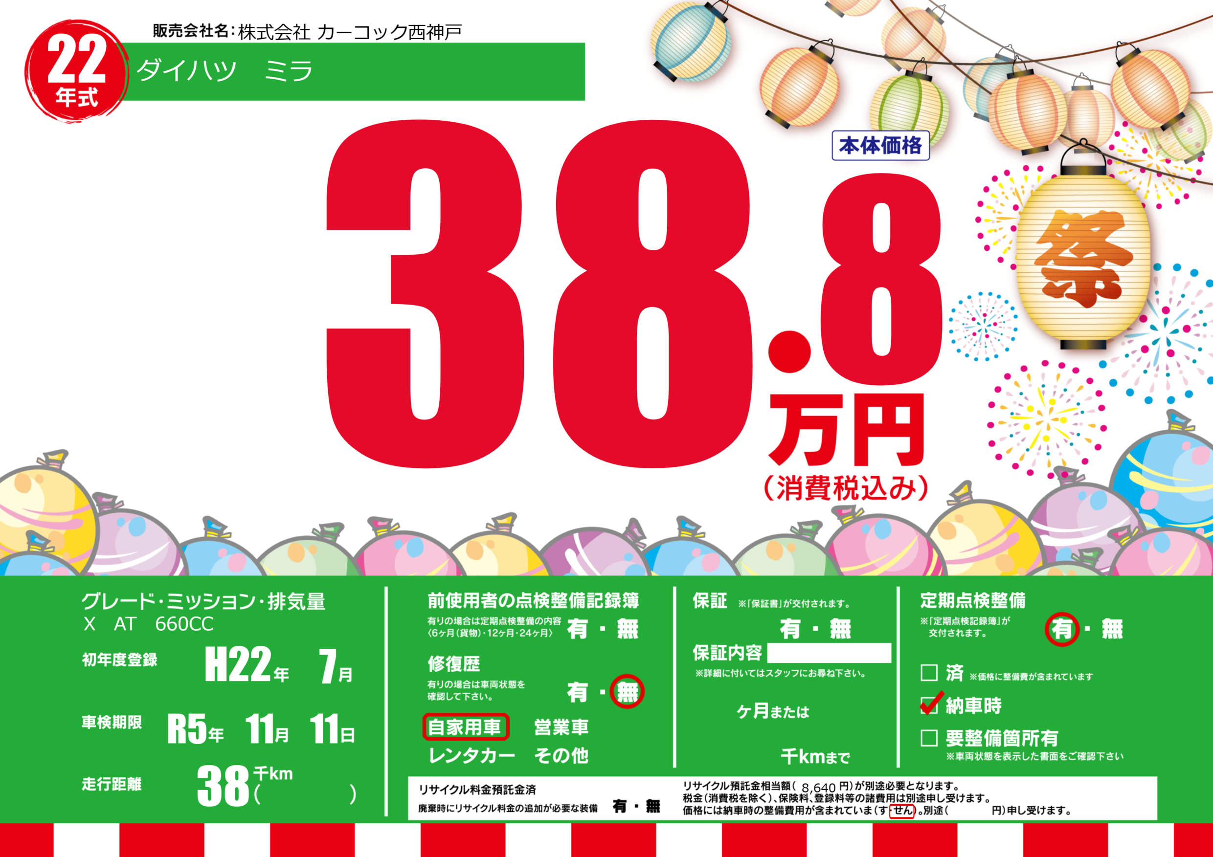 | 走行キロ | 3.8万km | 初年度登録 | H22年7月 |