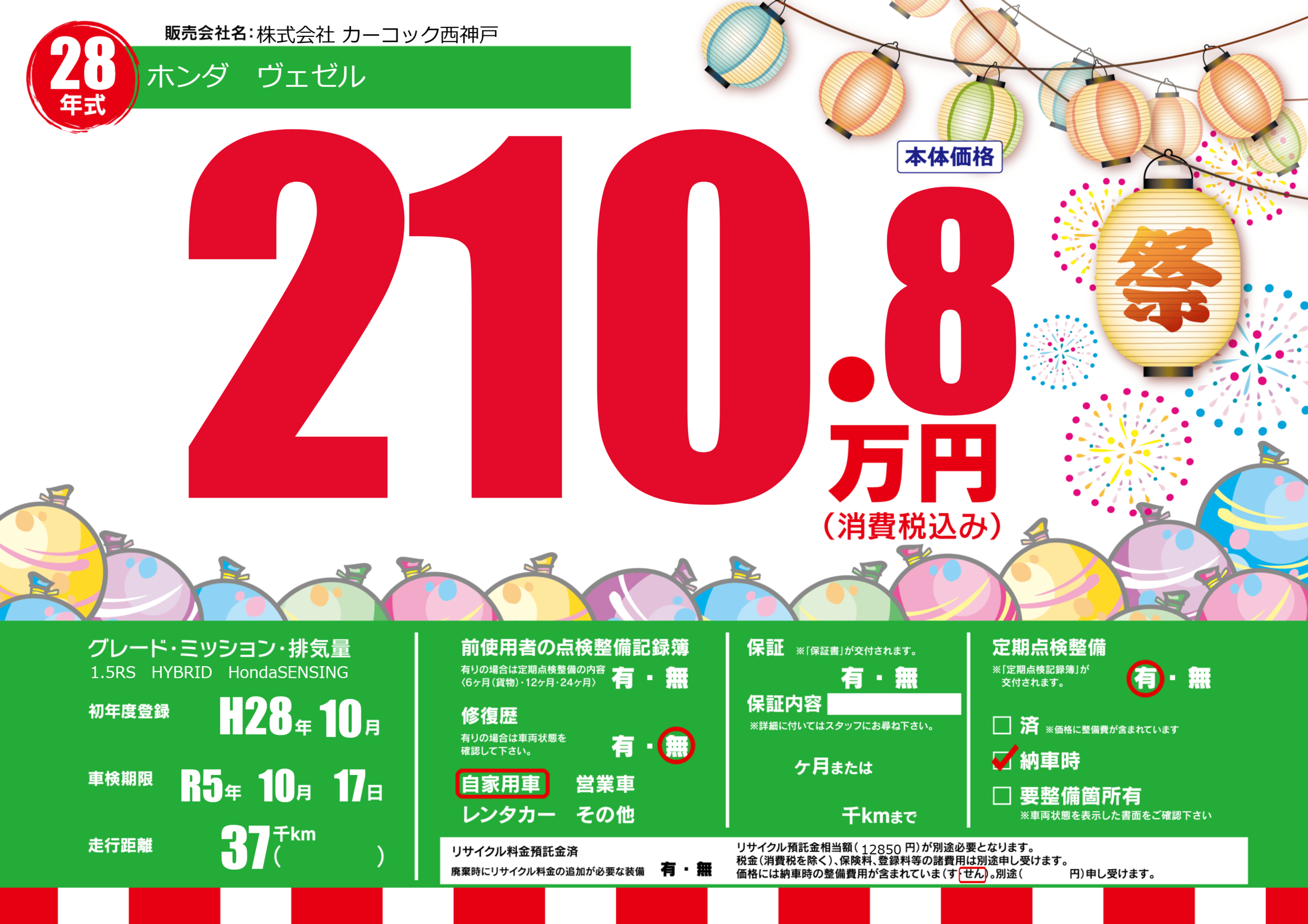 | 車名 | ホンダ ヴェゼル | グレード ミッション 排気量 |
