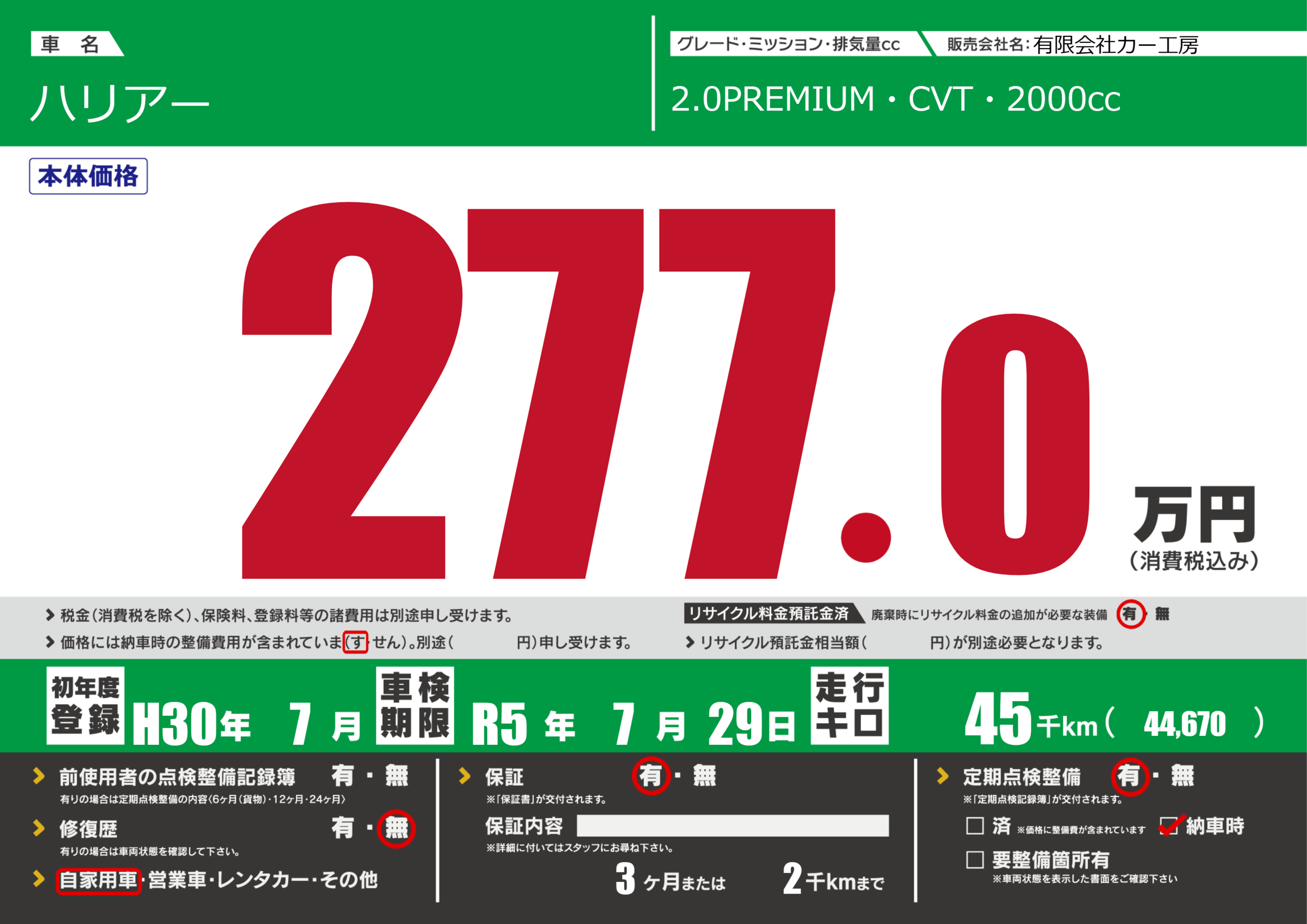 | 車名 | ハリアー | グレード ミッション 排気量 |