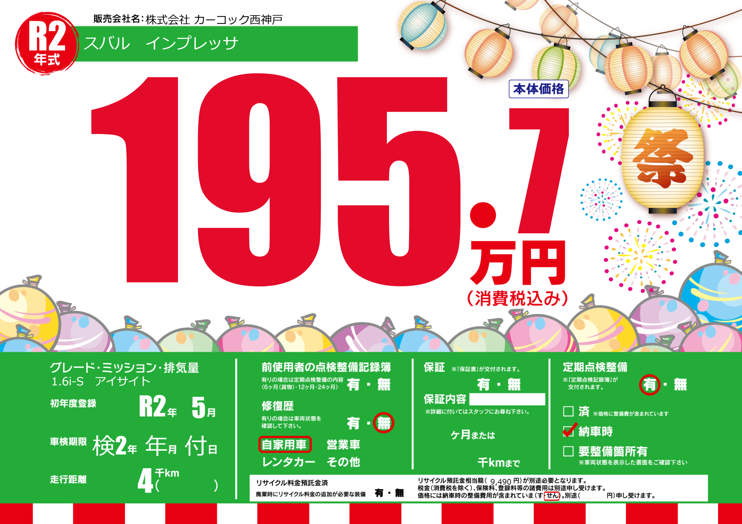 | 車名 | スバル インプレッサ | グレード ミッション 排気量 |