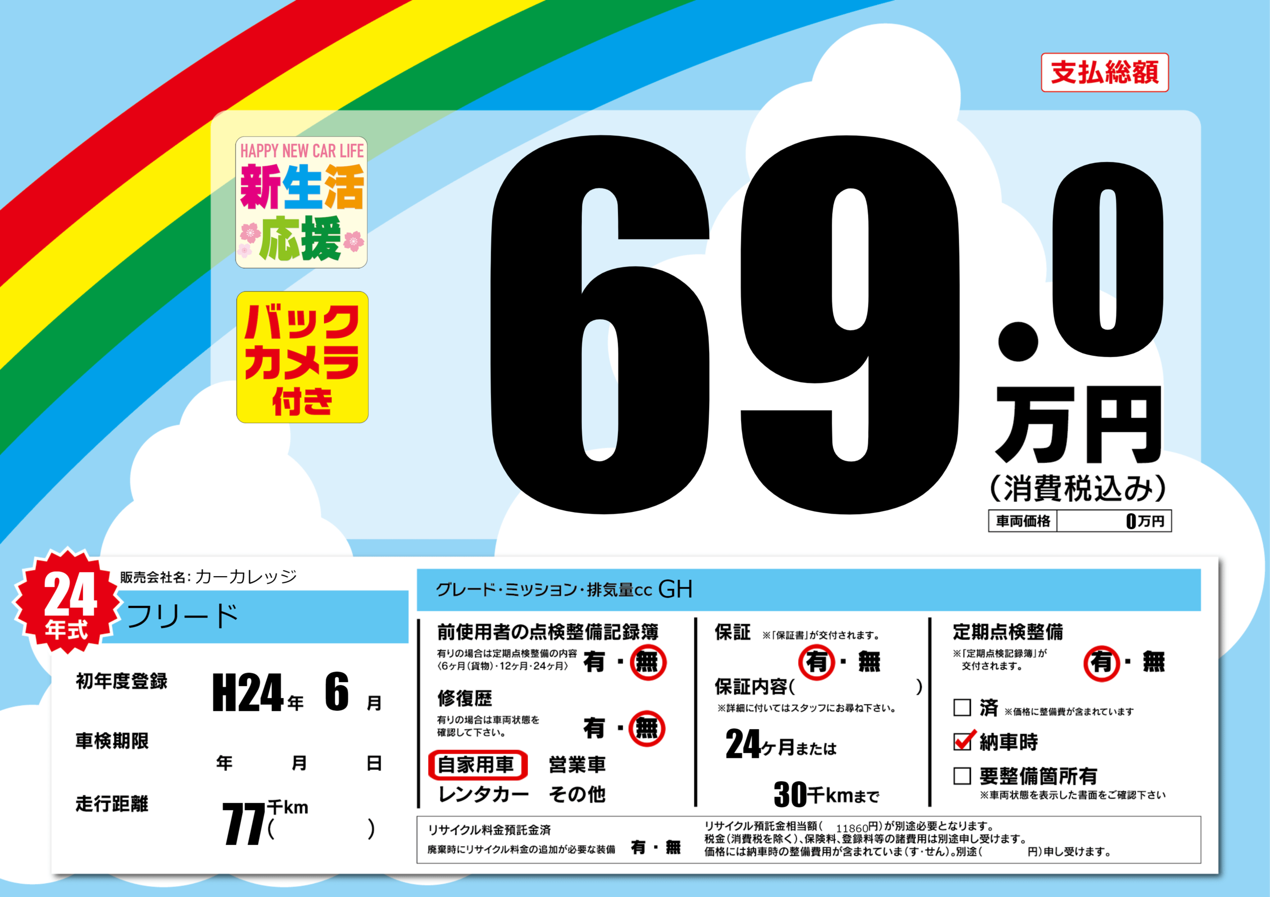保証付き 保証内容(---) 24ヶ月または(30)千kmまで |