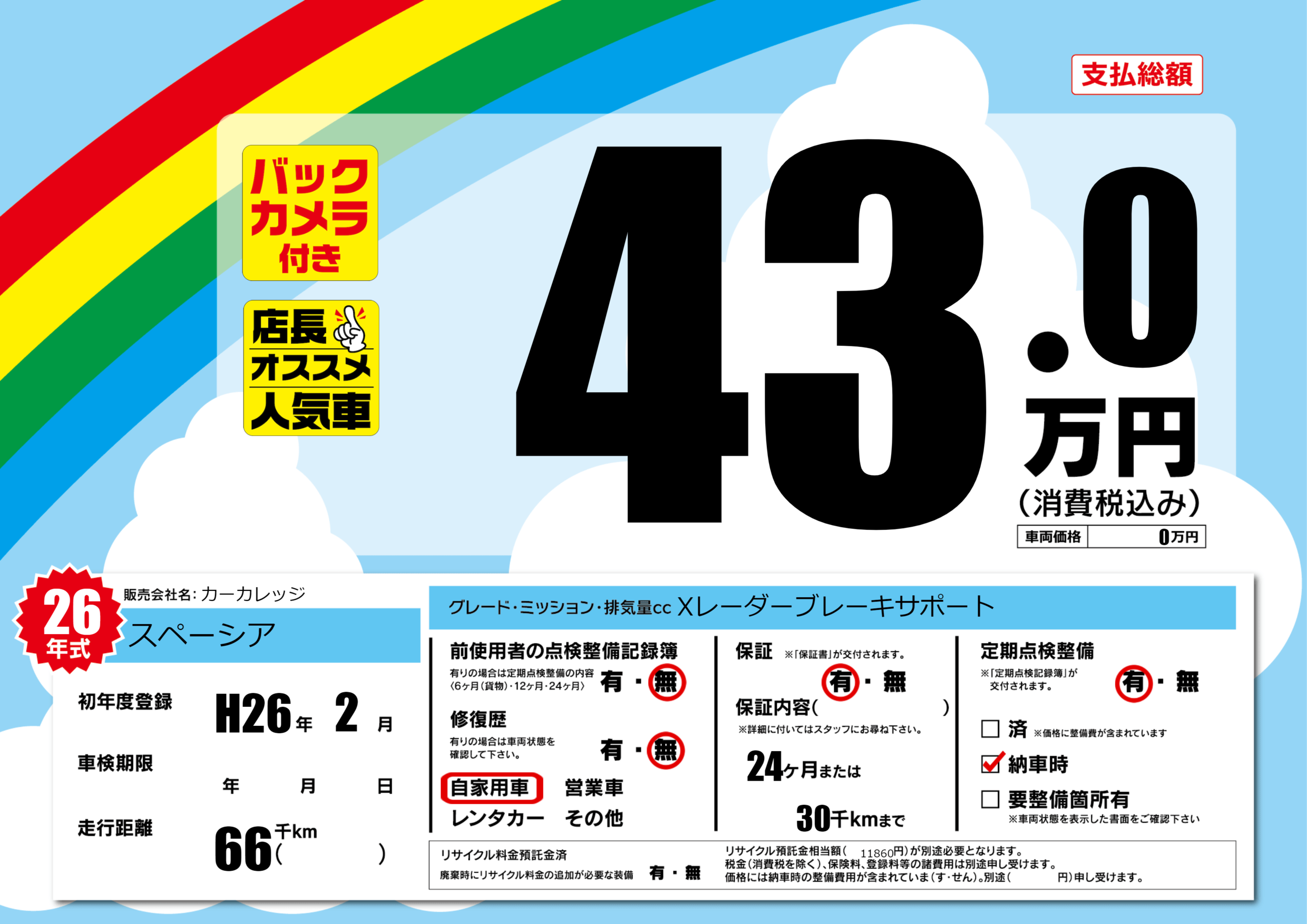 | 定期点検整備 | 定期点検整備あり 納車時あり | ||