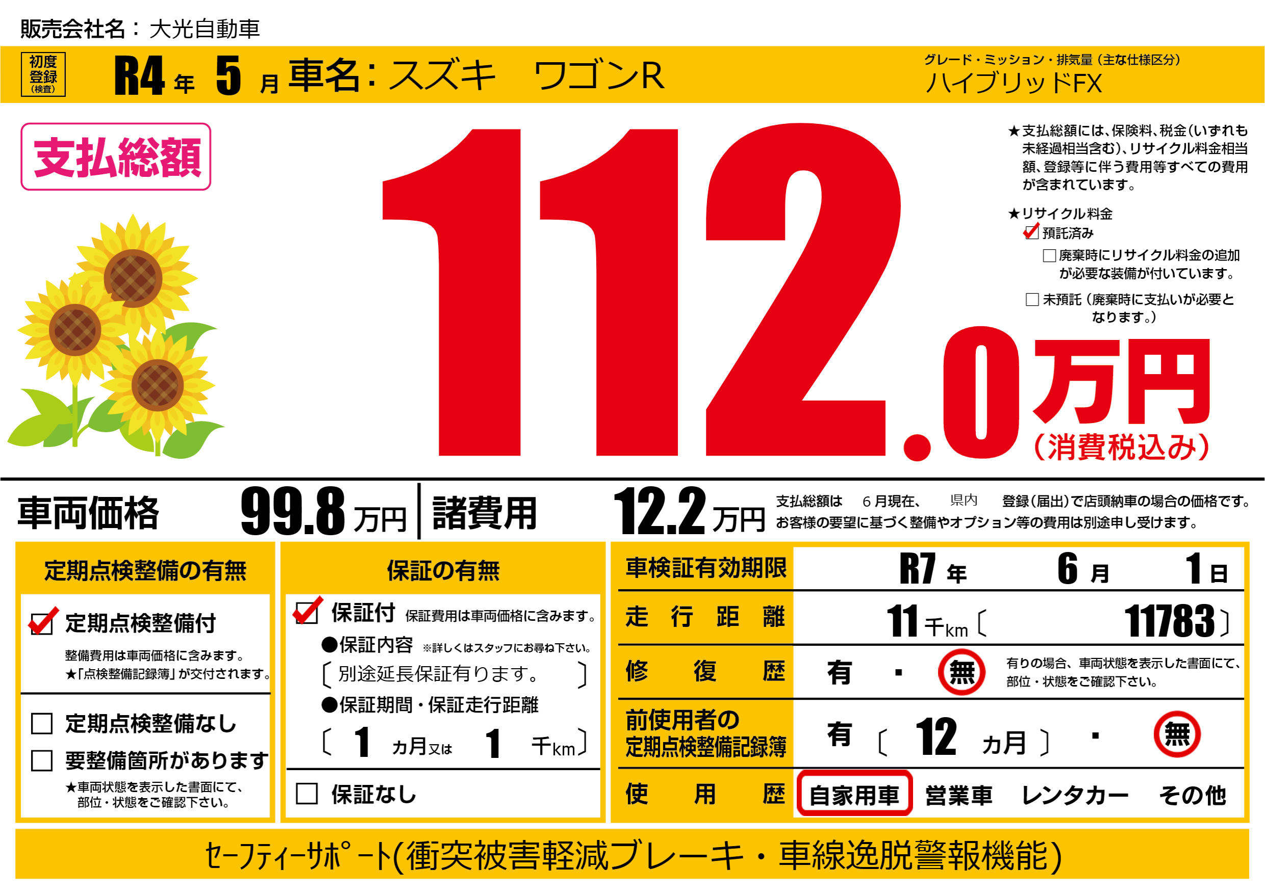 | 走行キロ | 1.1万km | 初年度登録 | R4年5月 |