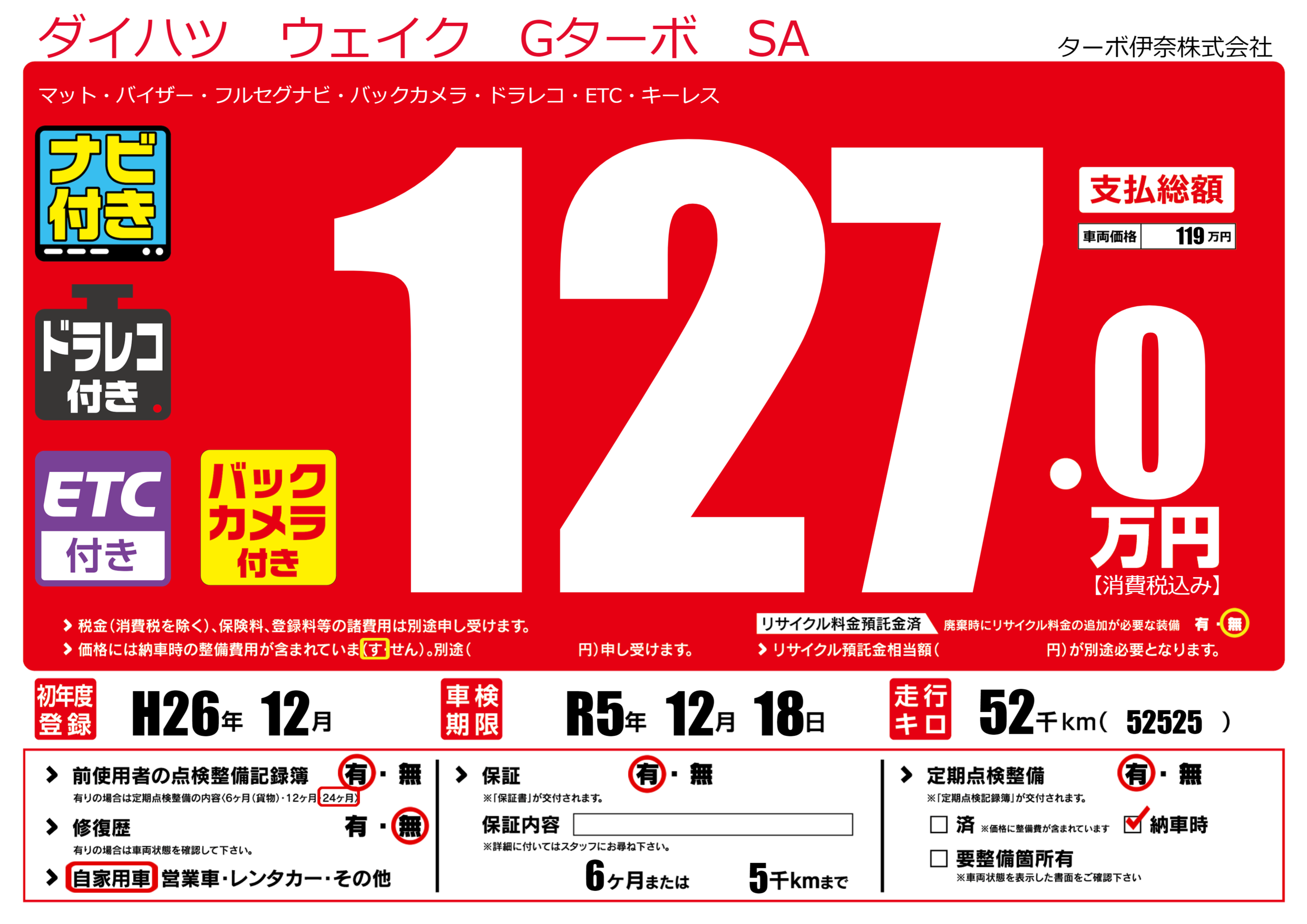 | 車名 | ダイハツ ウェイク Gターボ SA | グレード ミッション 排気量 |