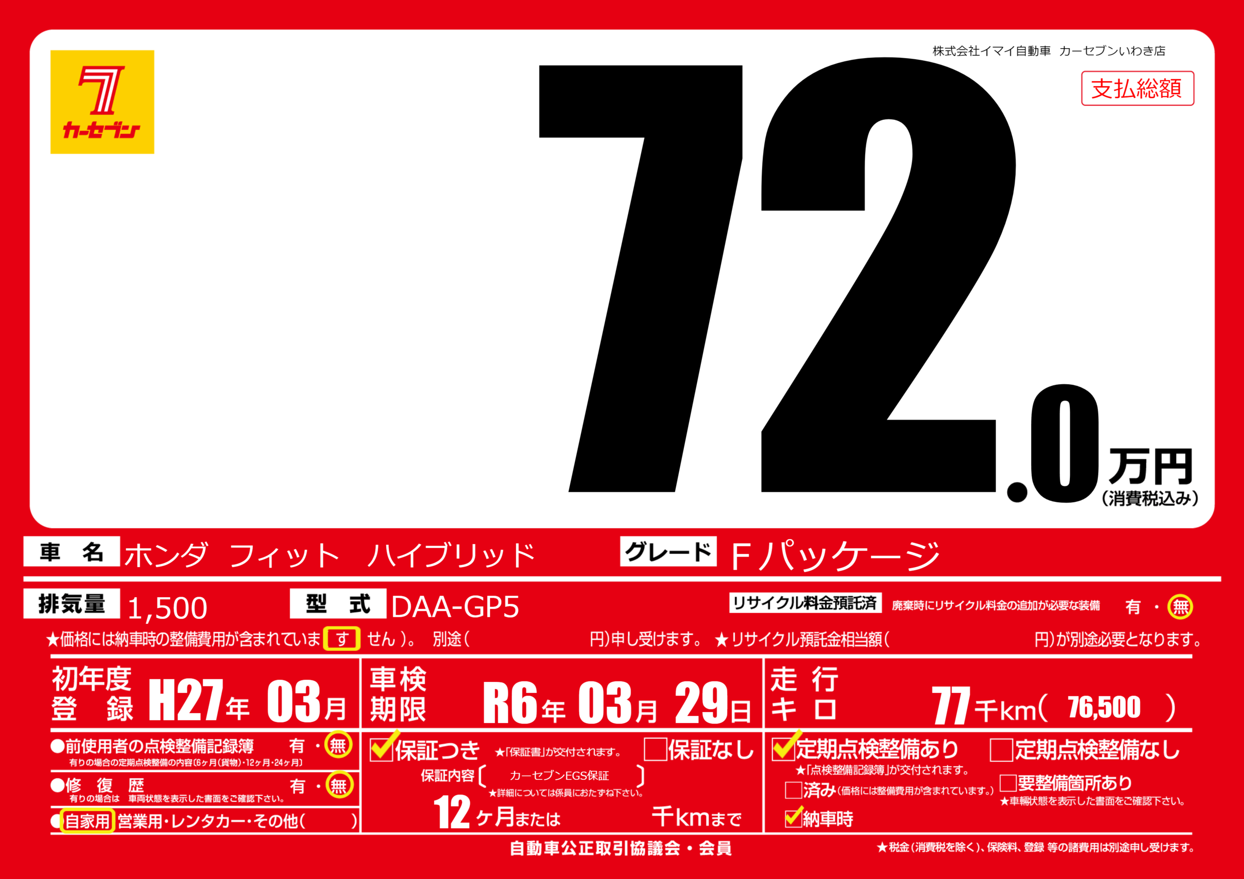 | 車名 | ホンダ フィット ハイブリッド | グレード ミッション 排気量 |