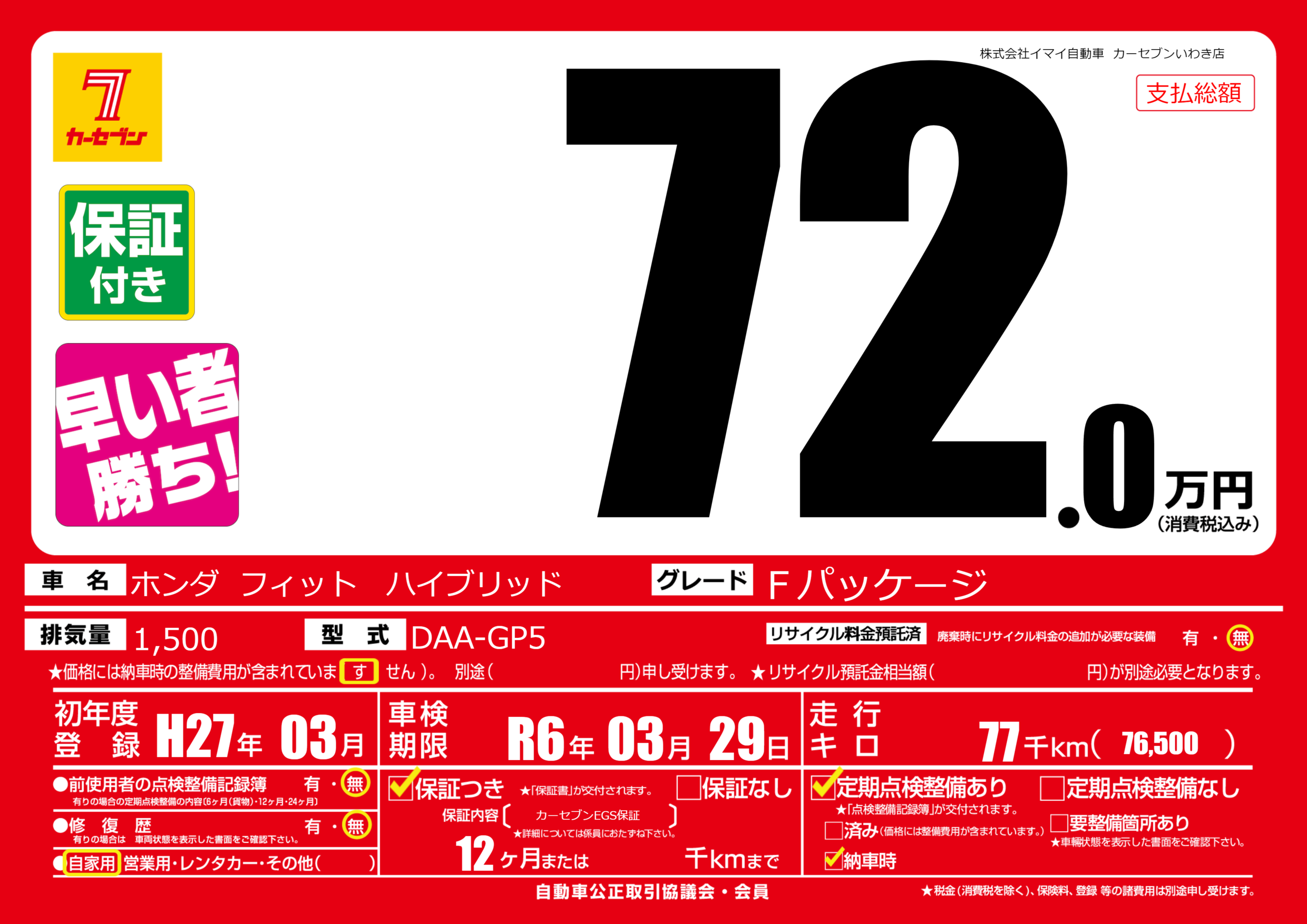保証内容(  カーセブンEGS保証) 12ヶ月または千km