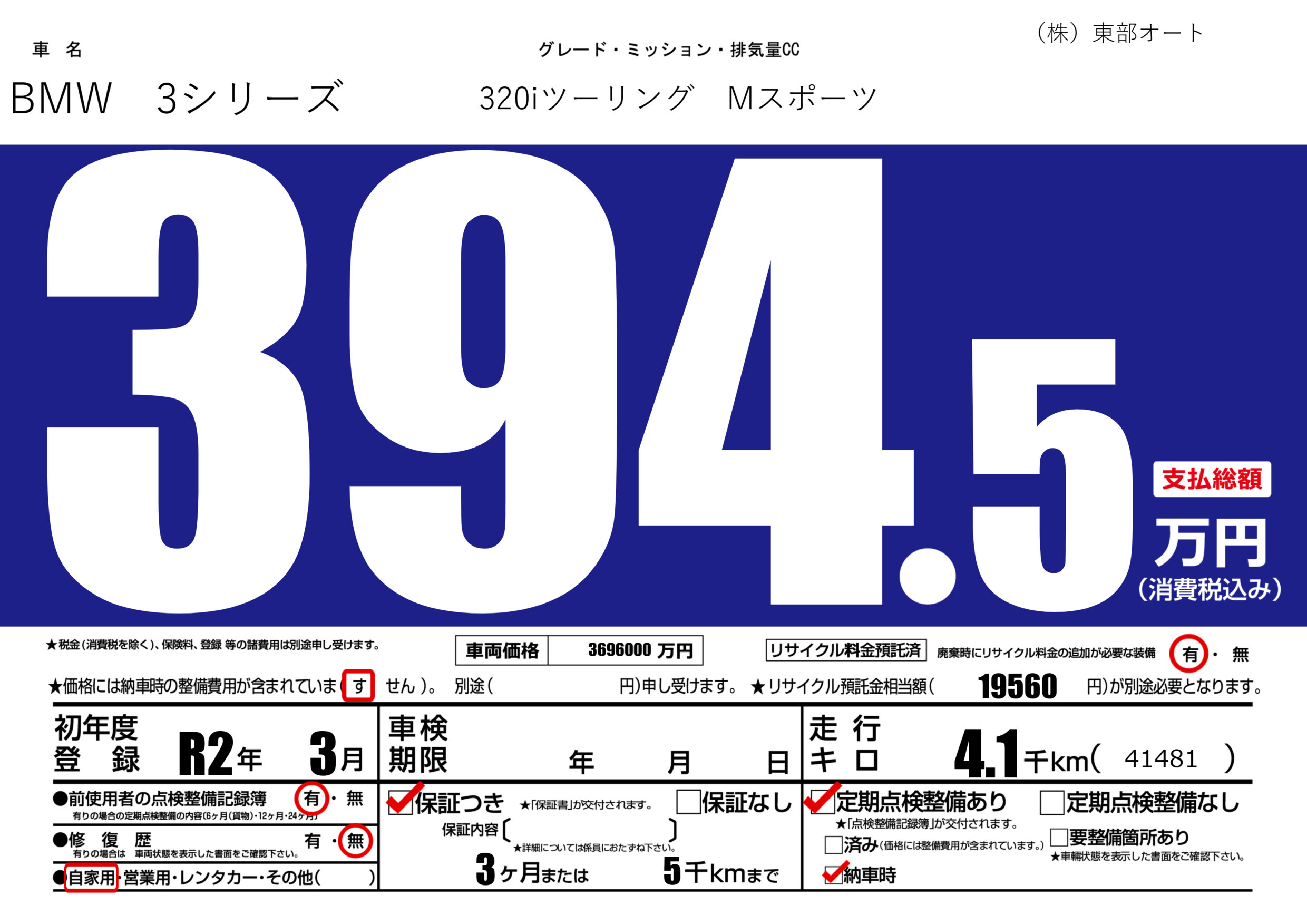 | 車名 | BMW 3シリーズ | グレード ミッション 排気量 |