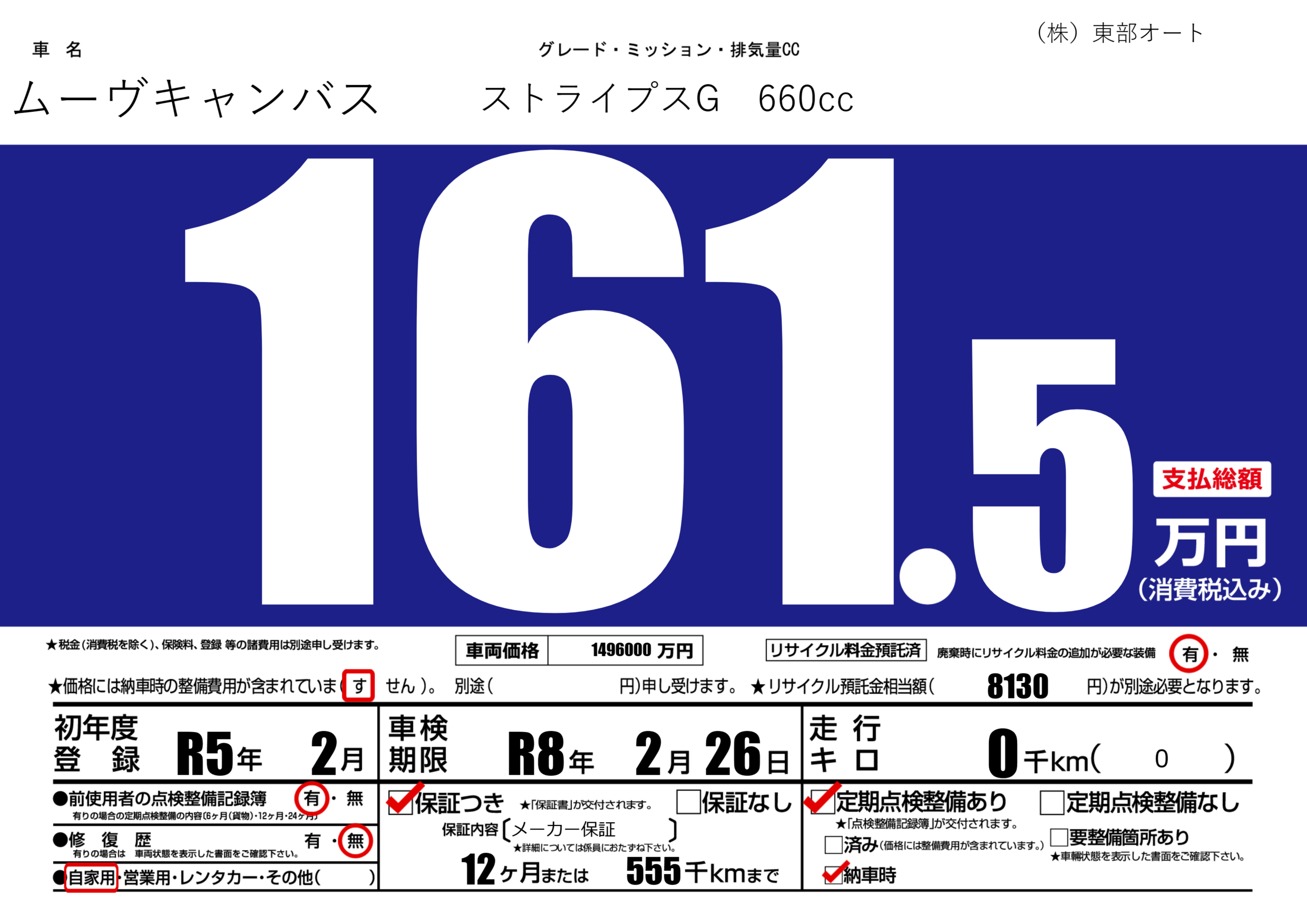 | 定期点検整備 | 定期点検整備あり 納車時あり | ||