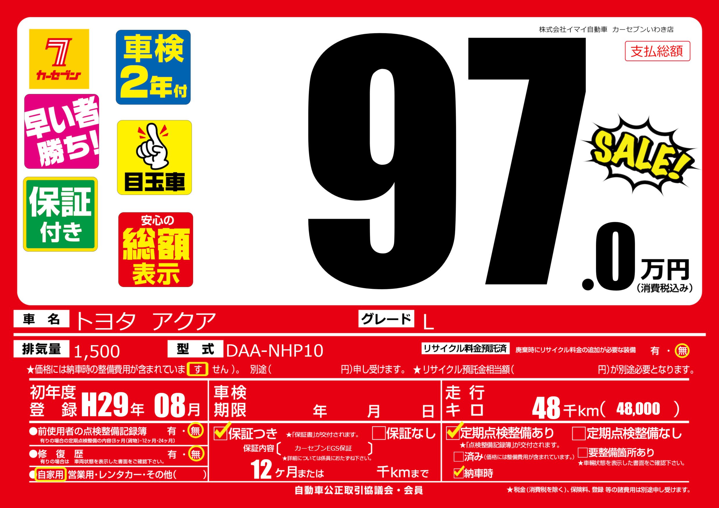保証付き 保証内容( カーセブンEGS保証) 12ヶ月または千km |