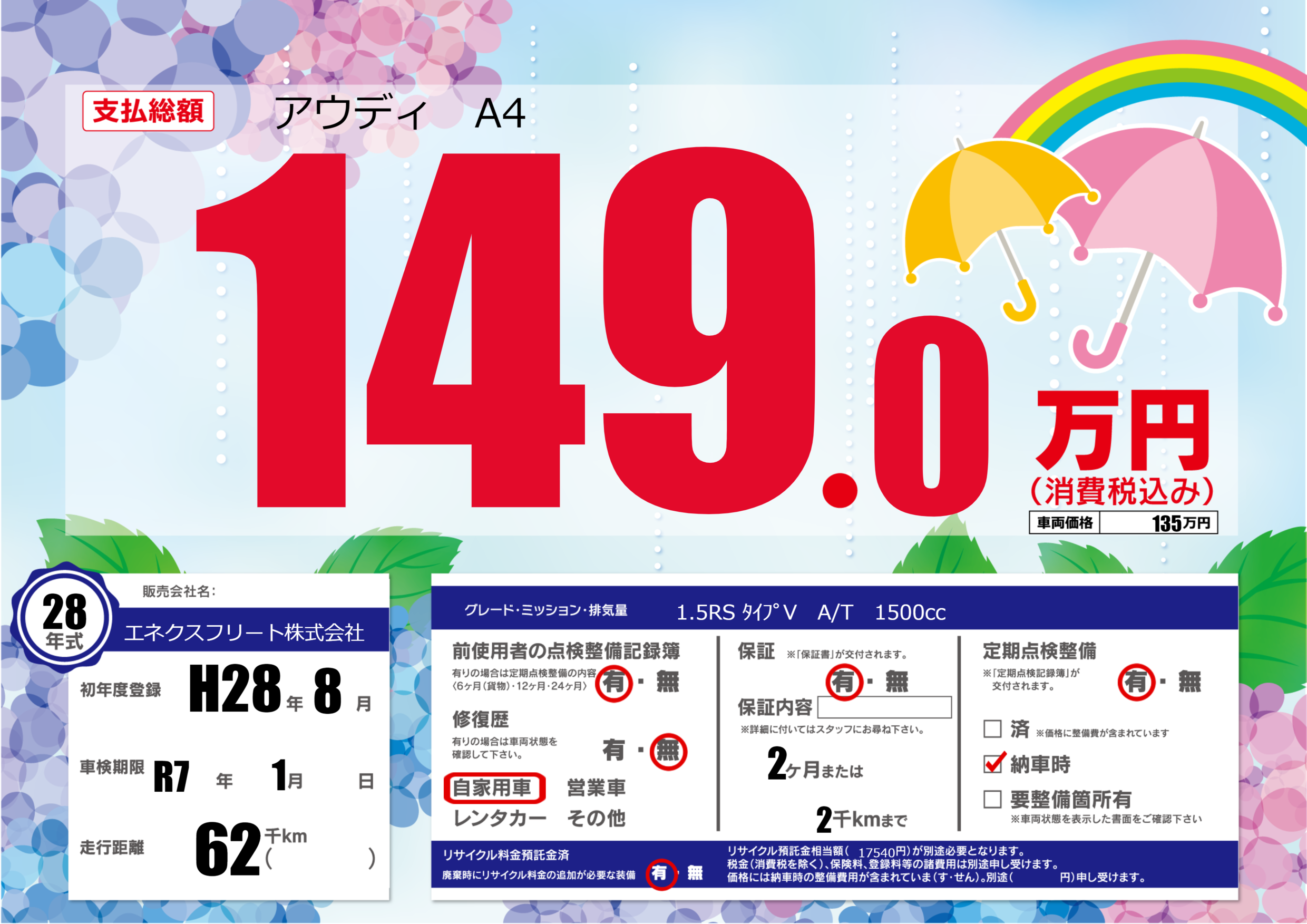 | 車名 | アウディ A4 | グレード ミッション 排気量 |