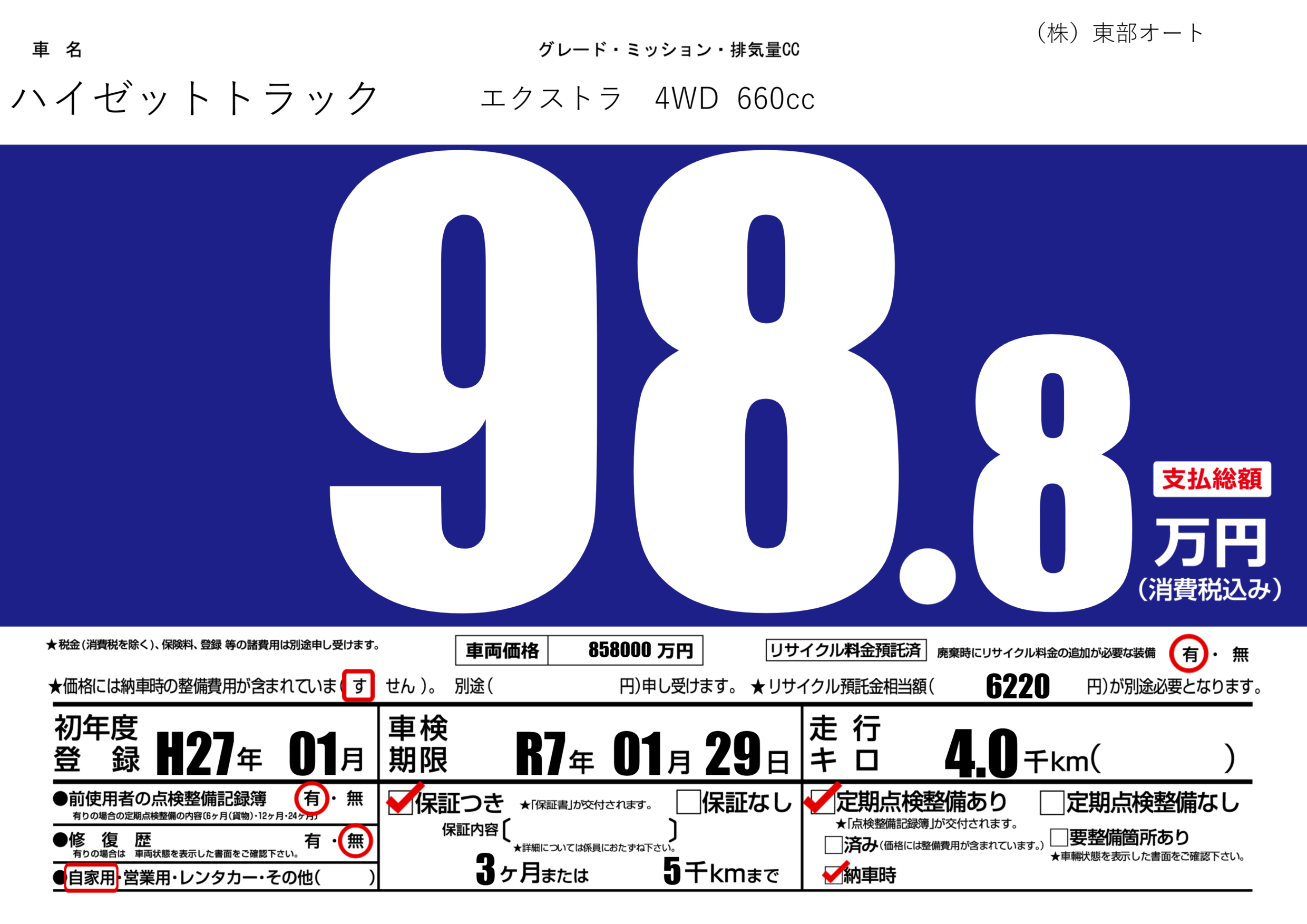 | 車名 | ハイゼットトラック | グレード ミッション 排気量 |
