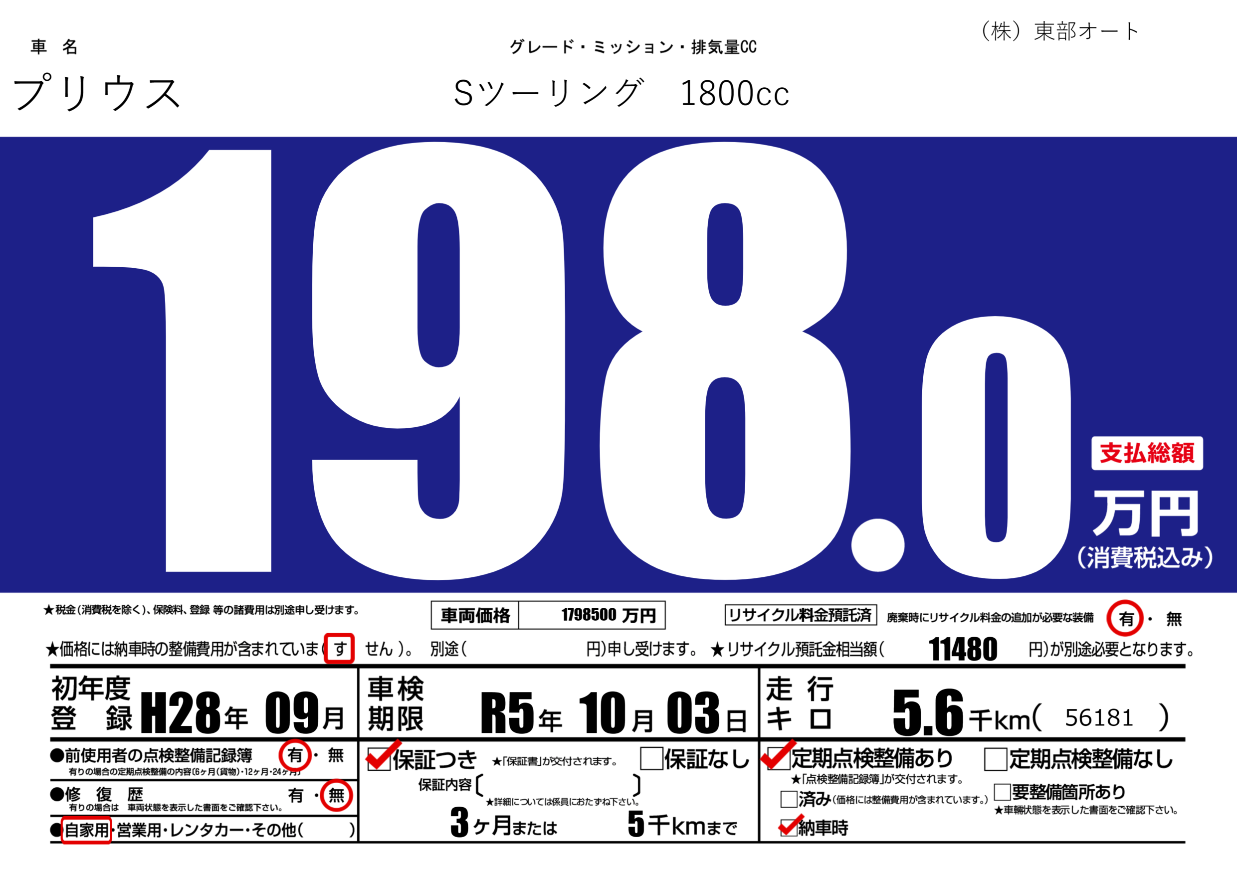 保証付き 保証内容(---) 3ヶ月または(5)千kmまで |