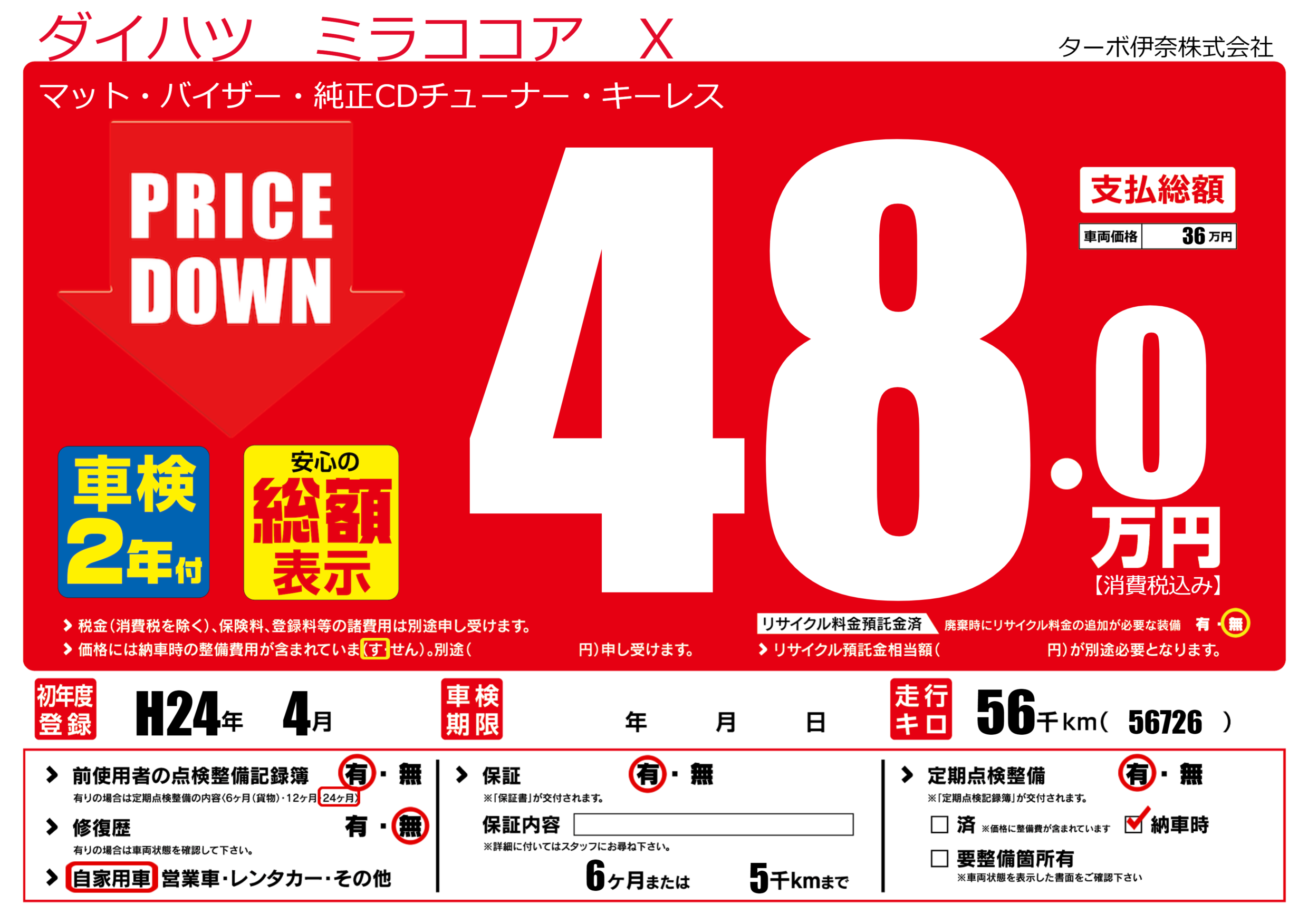 | 走行キロ | 5.6万km | 初年度登録 | H24年4月 |