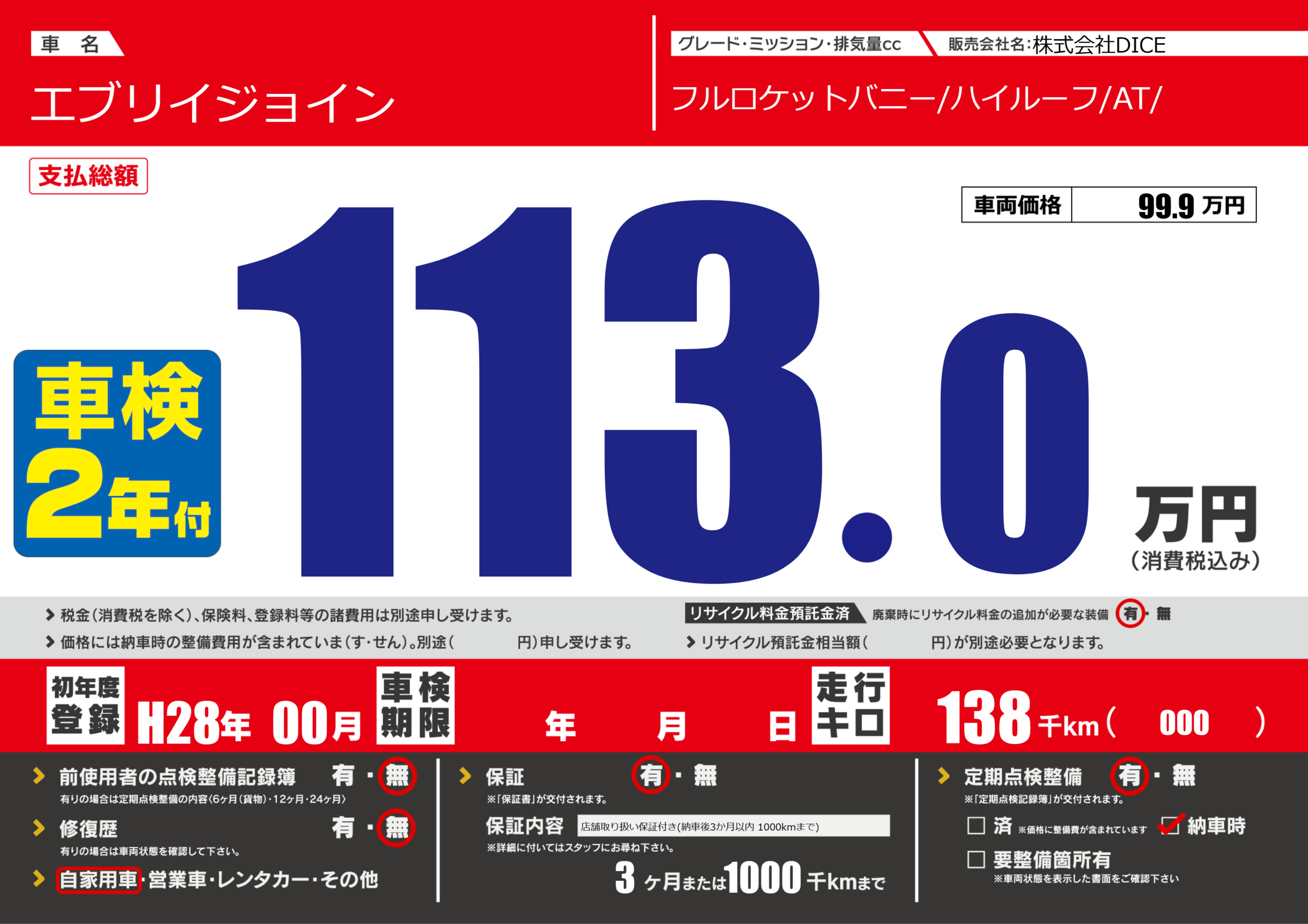 | 車名 | エブリイジョイン | グレード ミッション 排気量 |