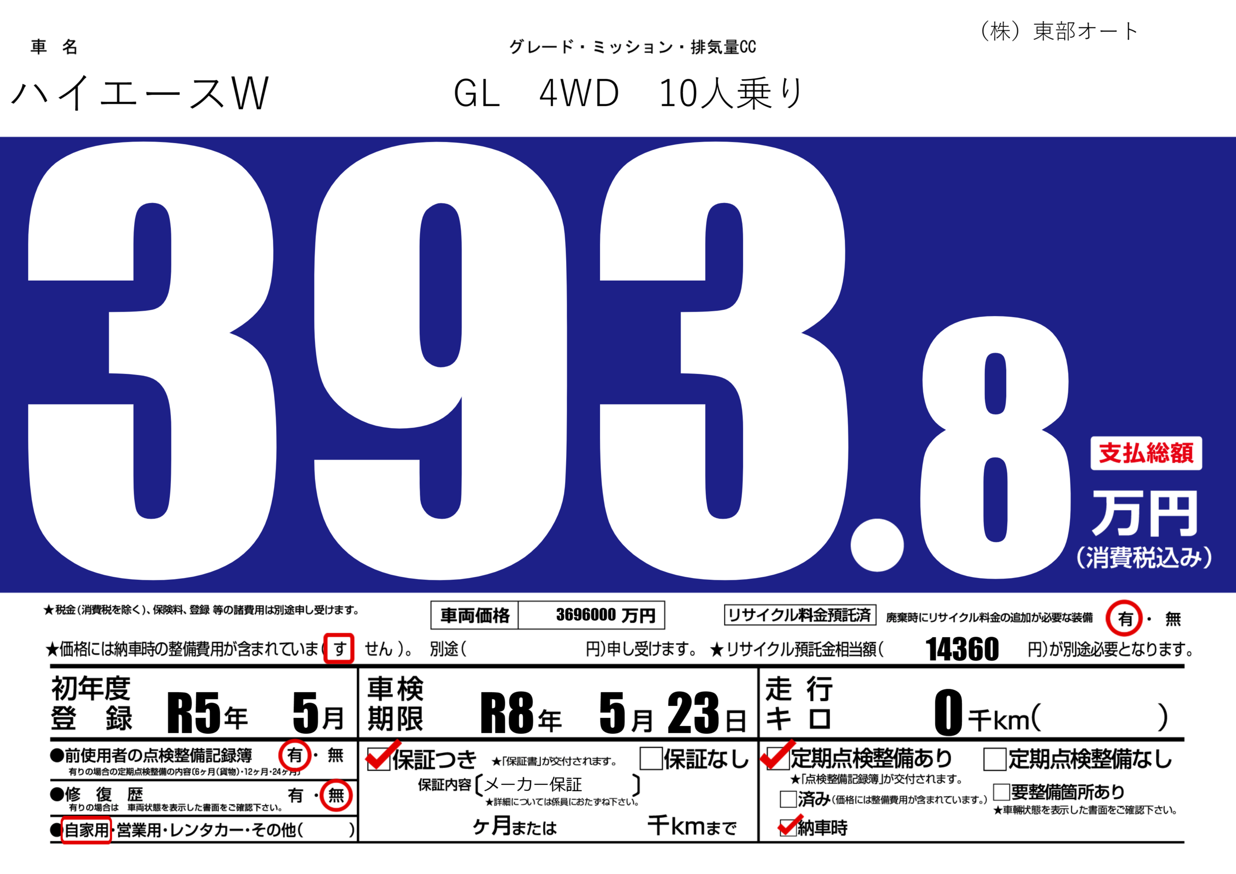 | 車名 | ハイエースW | グレード ミッション 排気量 |