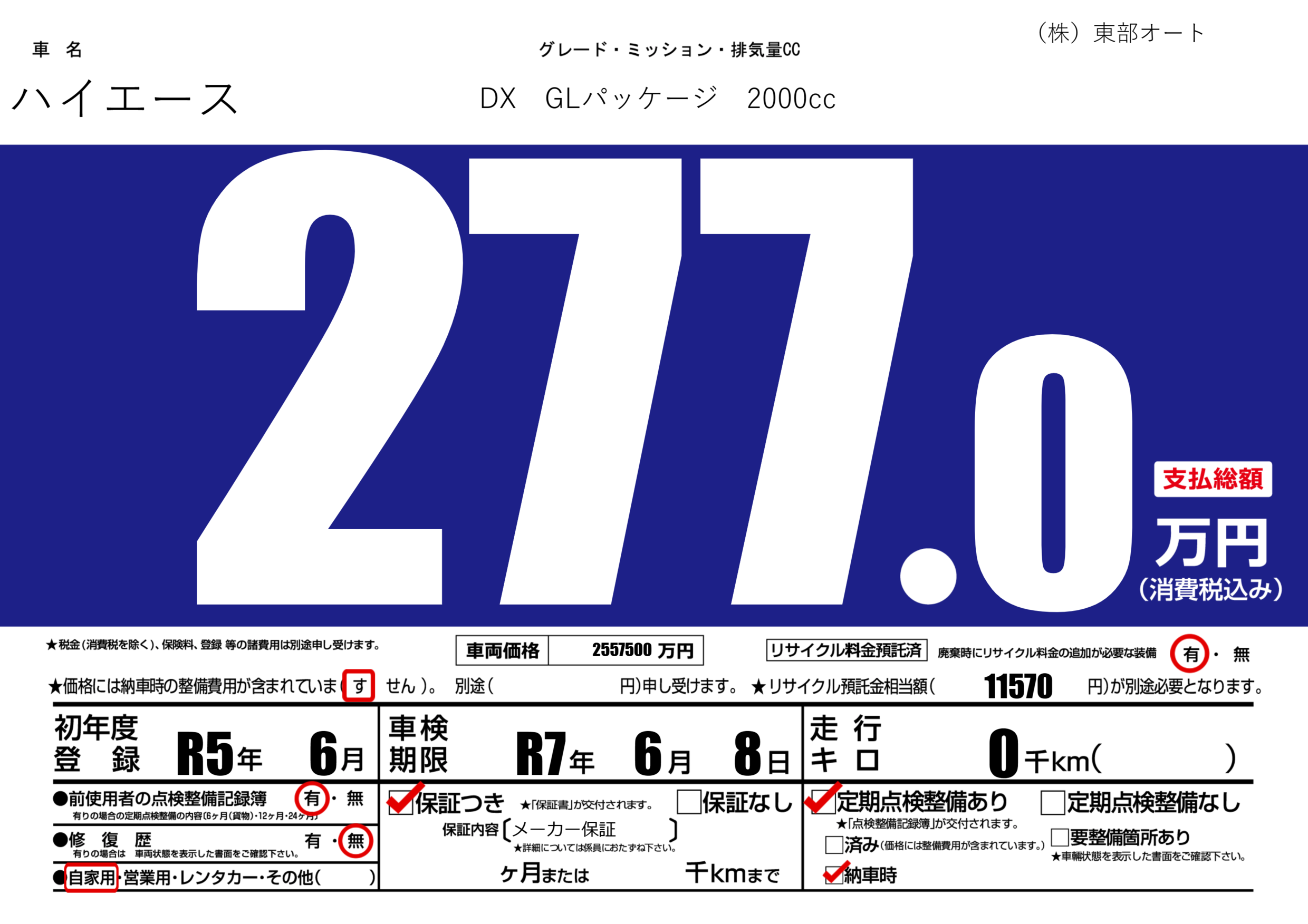| 車名 | ハイエース | グレード ミッション 排気量 |