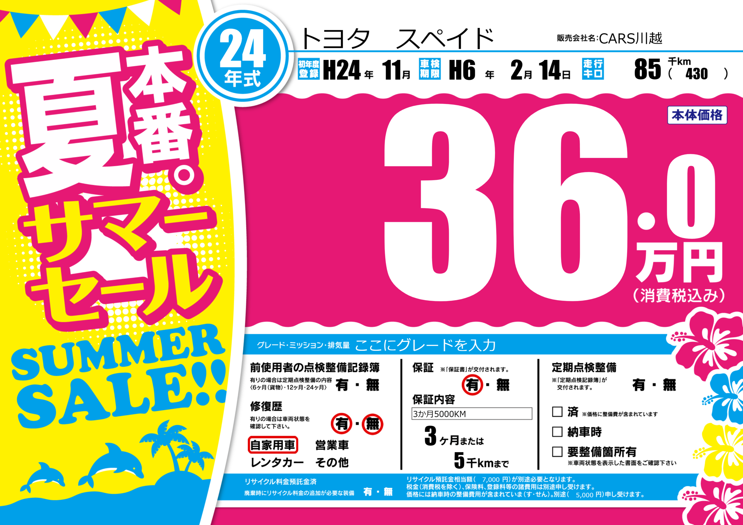 | 車名 | トヨタ スペイド | グレード ミッション 排気量 |