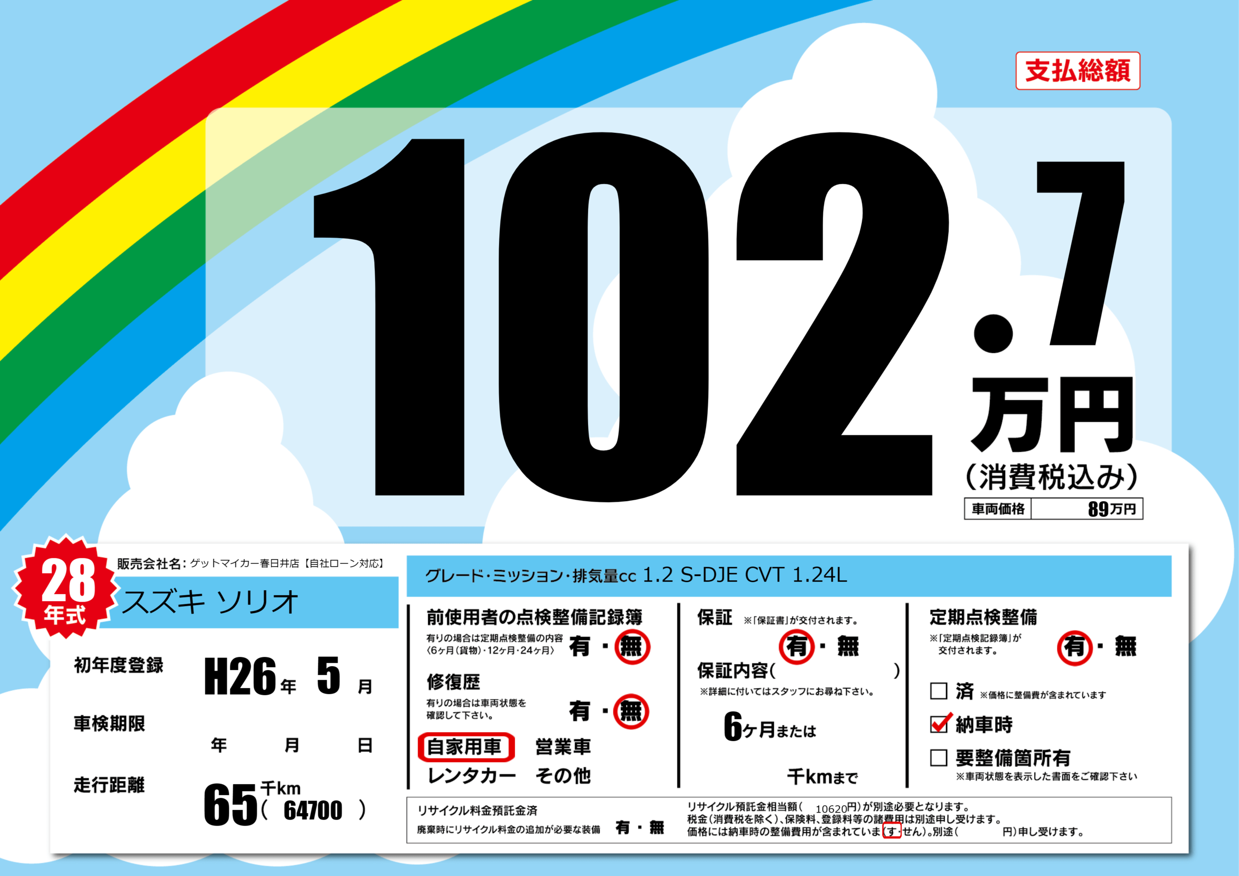 | 定期点検整備 | 定期点検整備あり 納車時あり | ||
