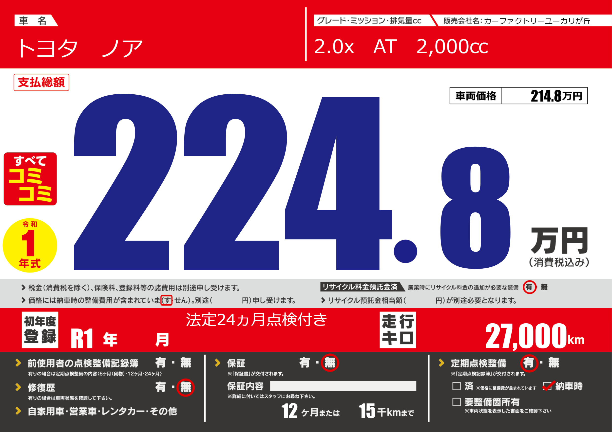 | 定期点検整備 | 定期点検整備あり 納車時あり | ||