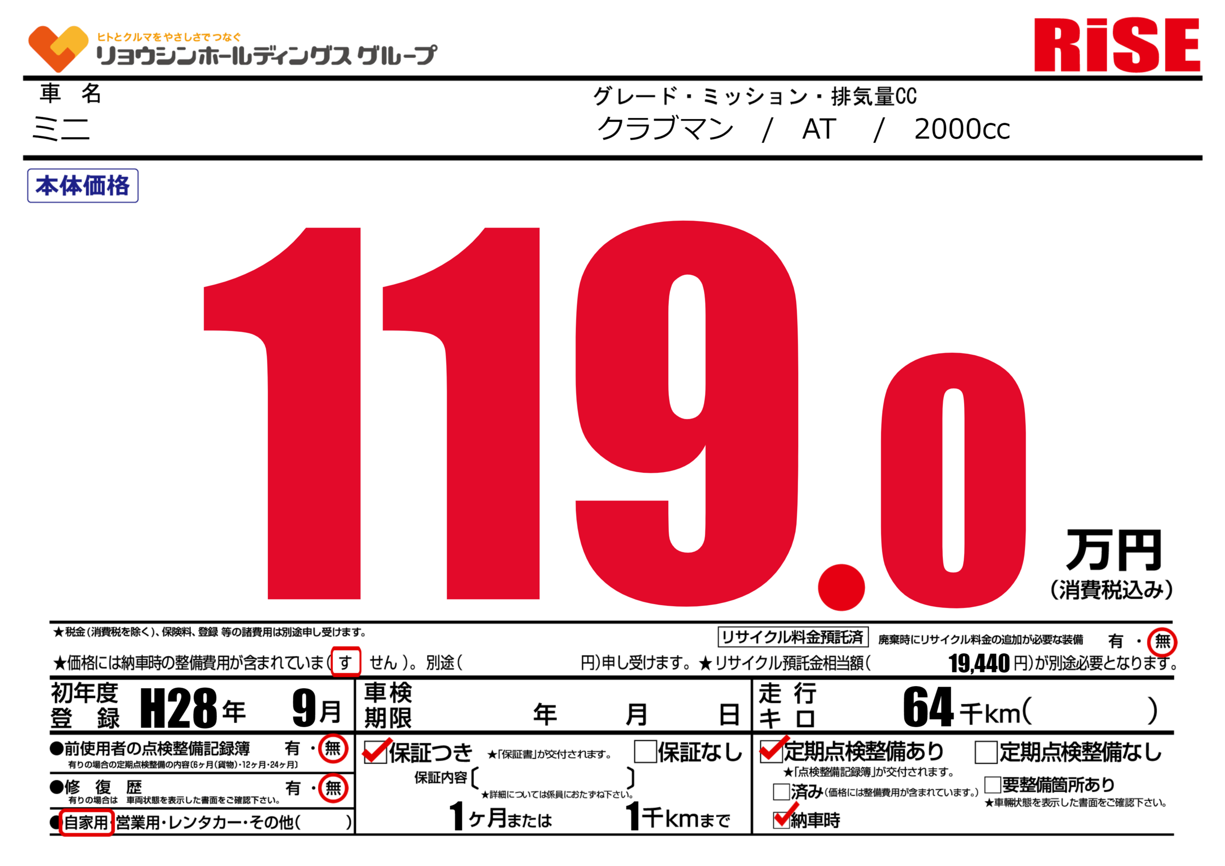 | 車名 | ミニ | グレード ミッション 排気量 |