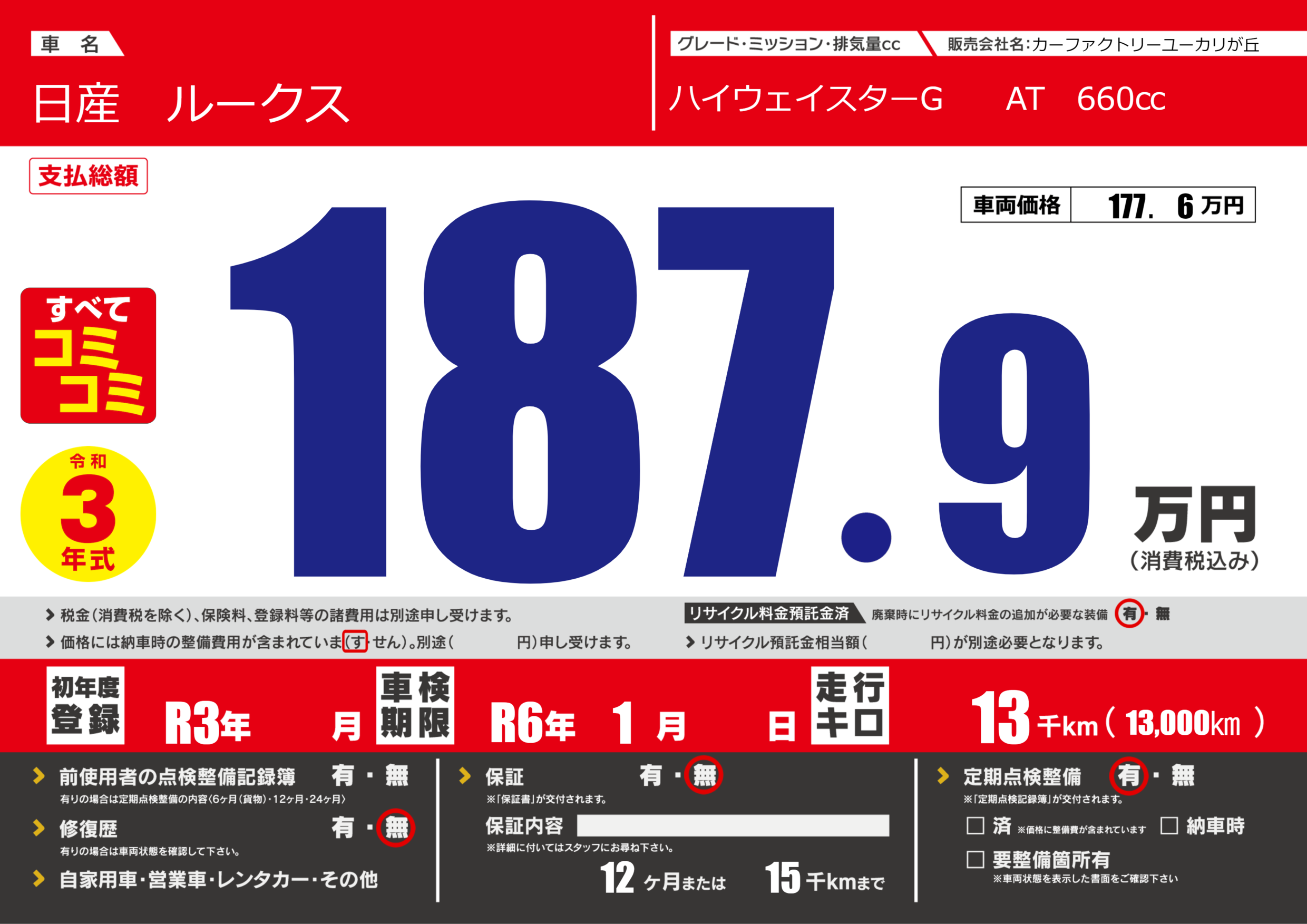 あり | 車検制限 | R6年1月---月 |