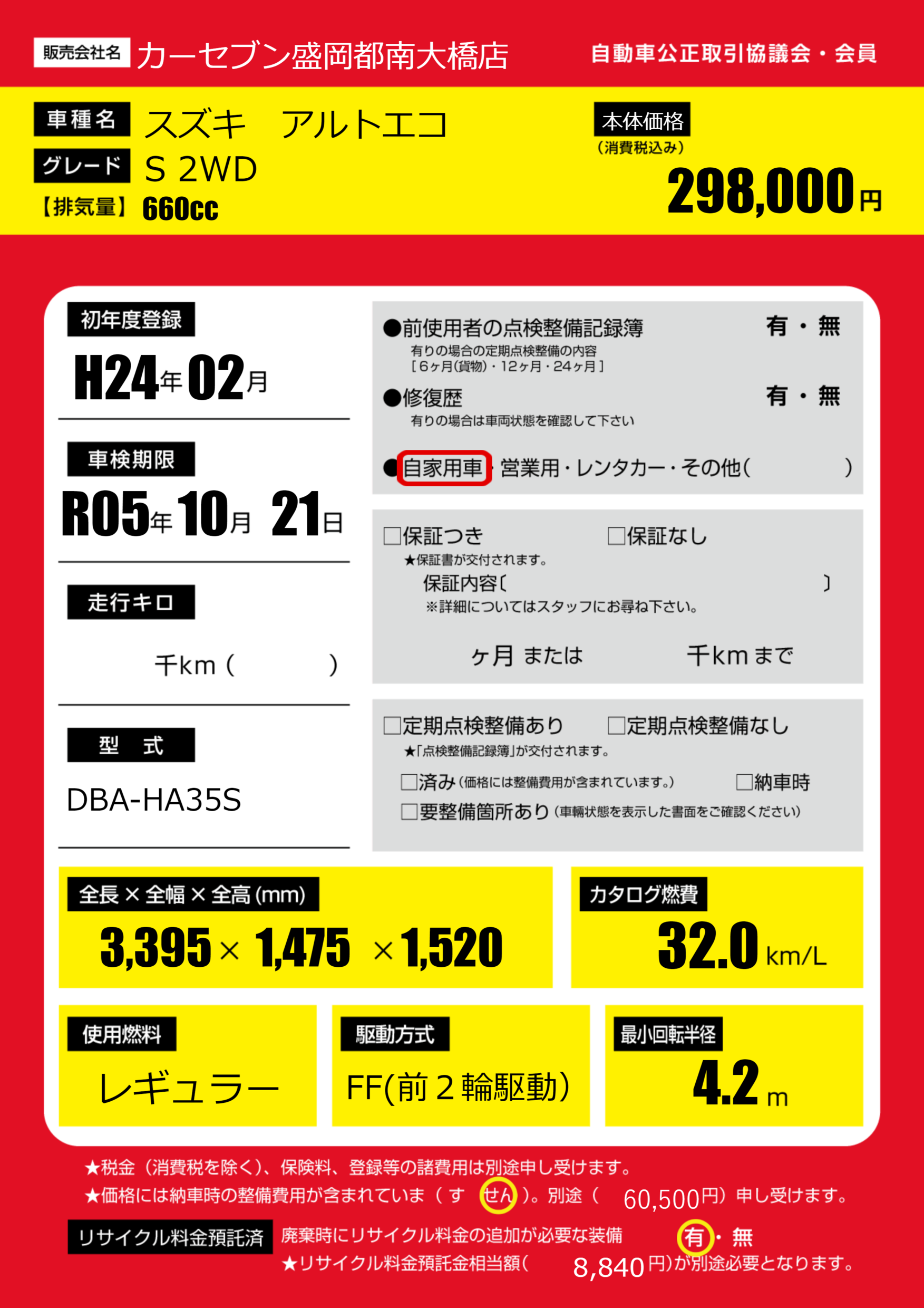 | 車名 | スズキ アルトエコ | グレード ミッション 排気量 |