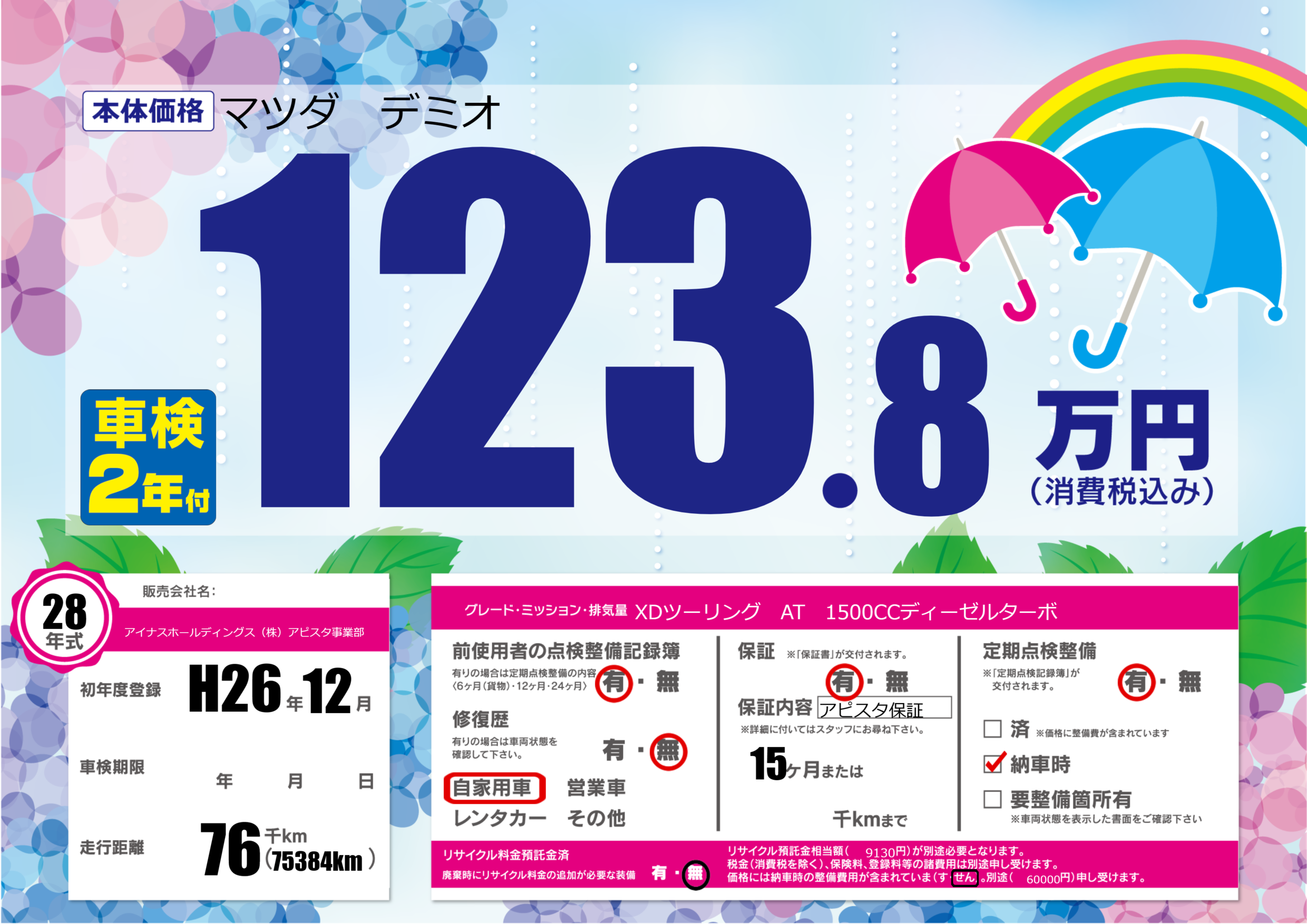 | 車名 | マツダ デミオ | グレード ミッション 排気量 |