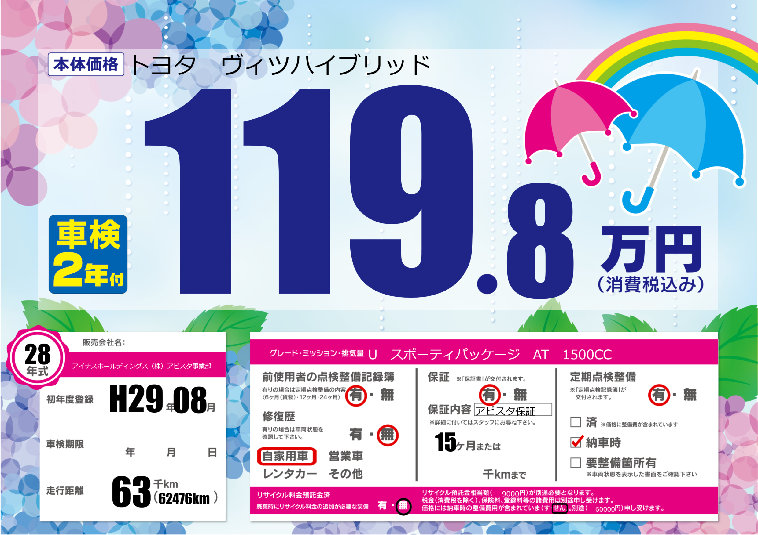 | 走行キロ | 6.3万km | 初年度登録 | H29年08月 |