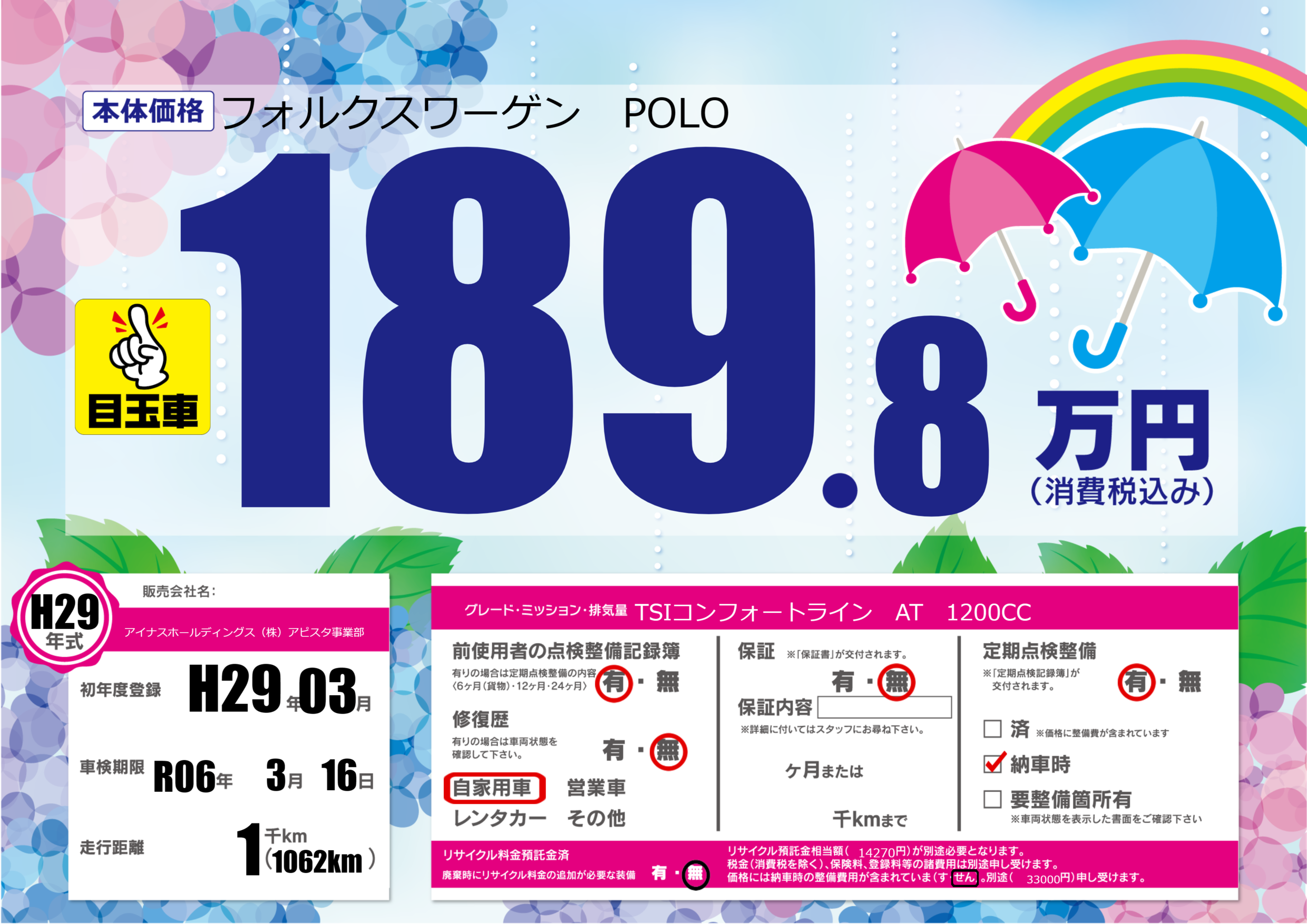 | 車名 | フォルクスワーゲン POLO | グレード ミッション 排気量 |