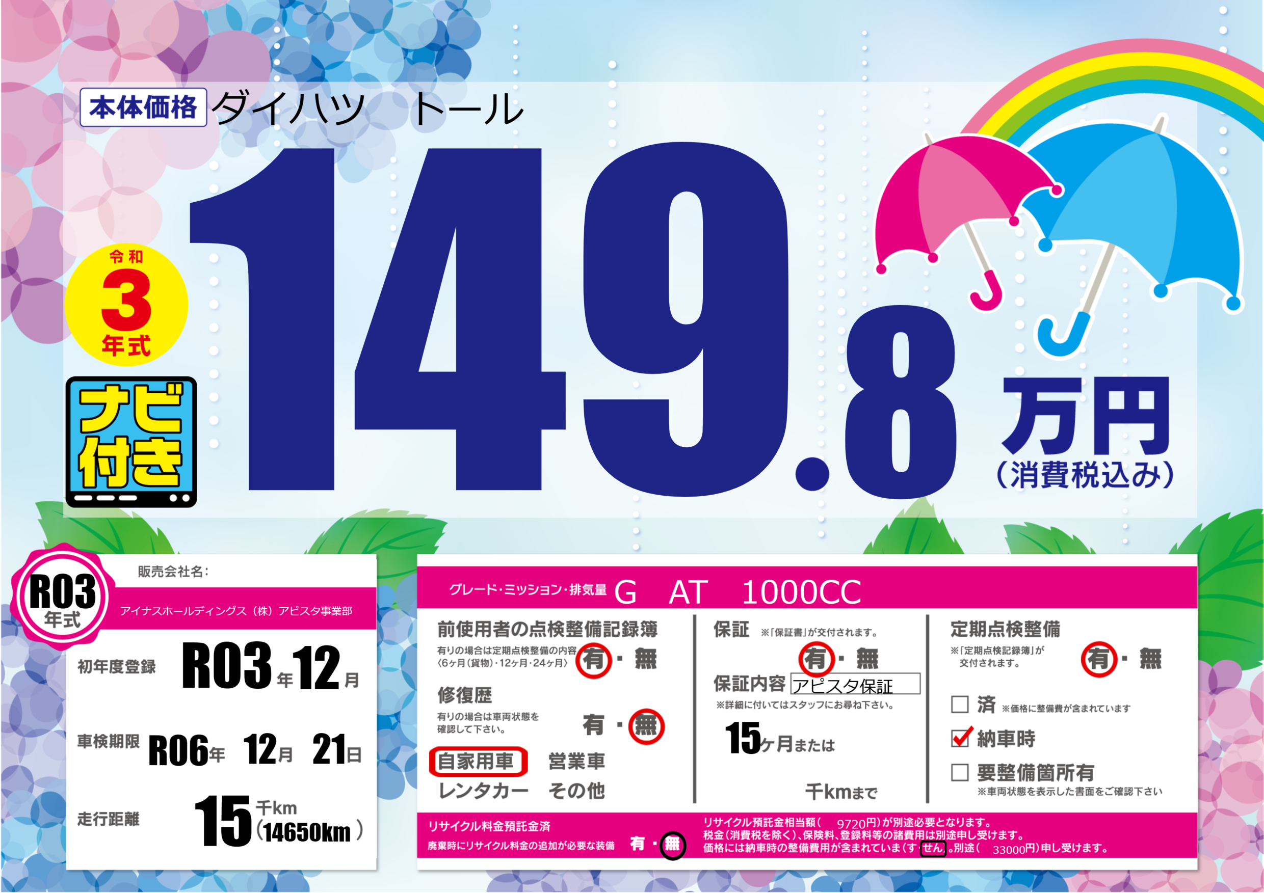| 車名 | ダイハツ トール | グレード ミッション 排気量 |