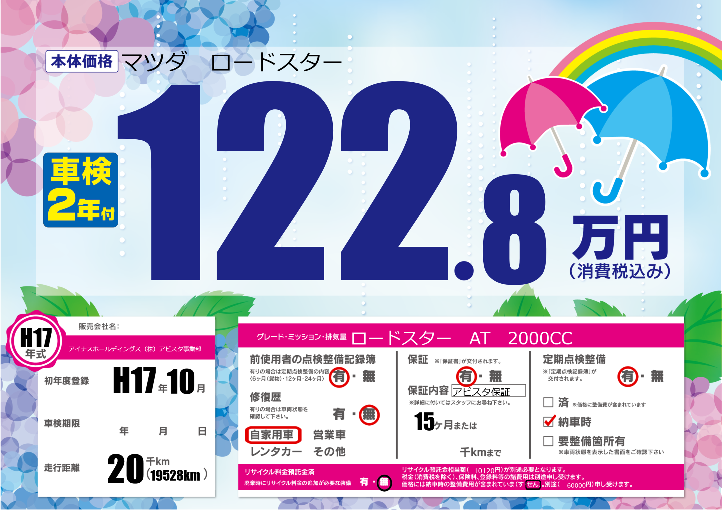 保証付き 保証内容(アピスタ保証) 15ヶ月または()千kmまで |