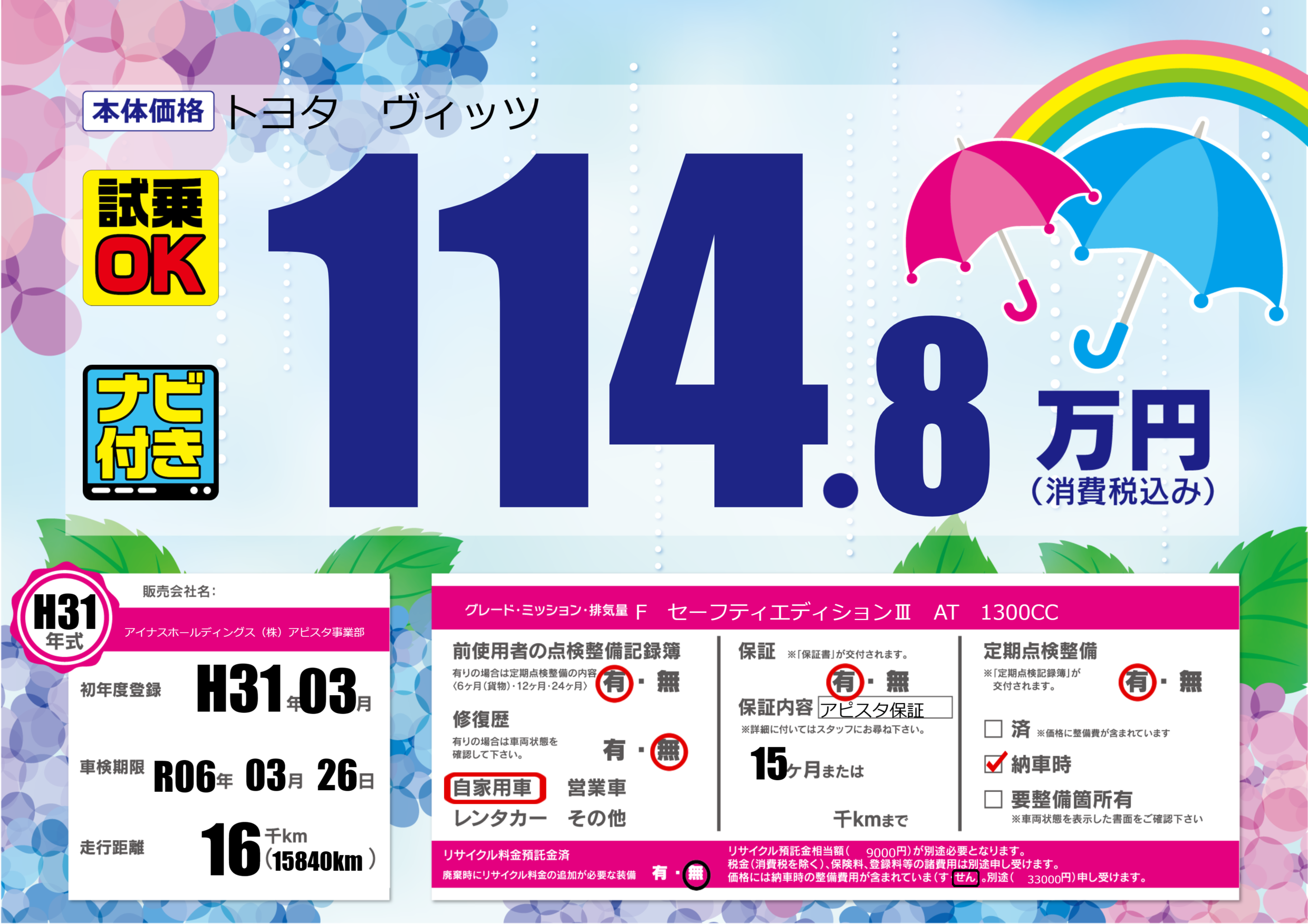 | 車名 | トヨタ ヴィッツ | グレード ミッション 排気量 |