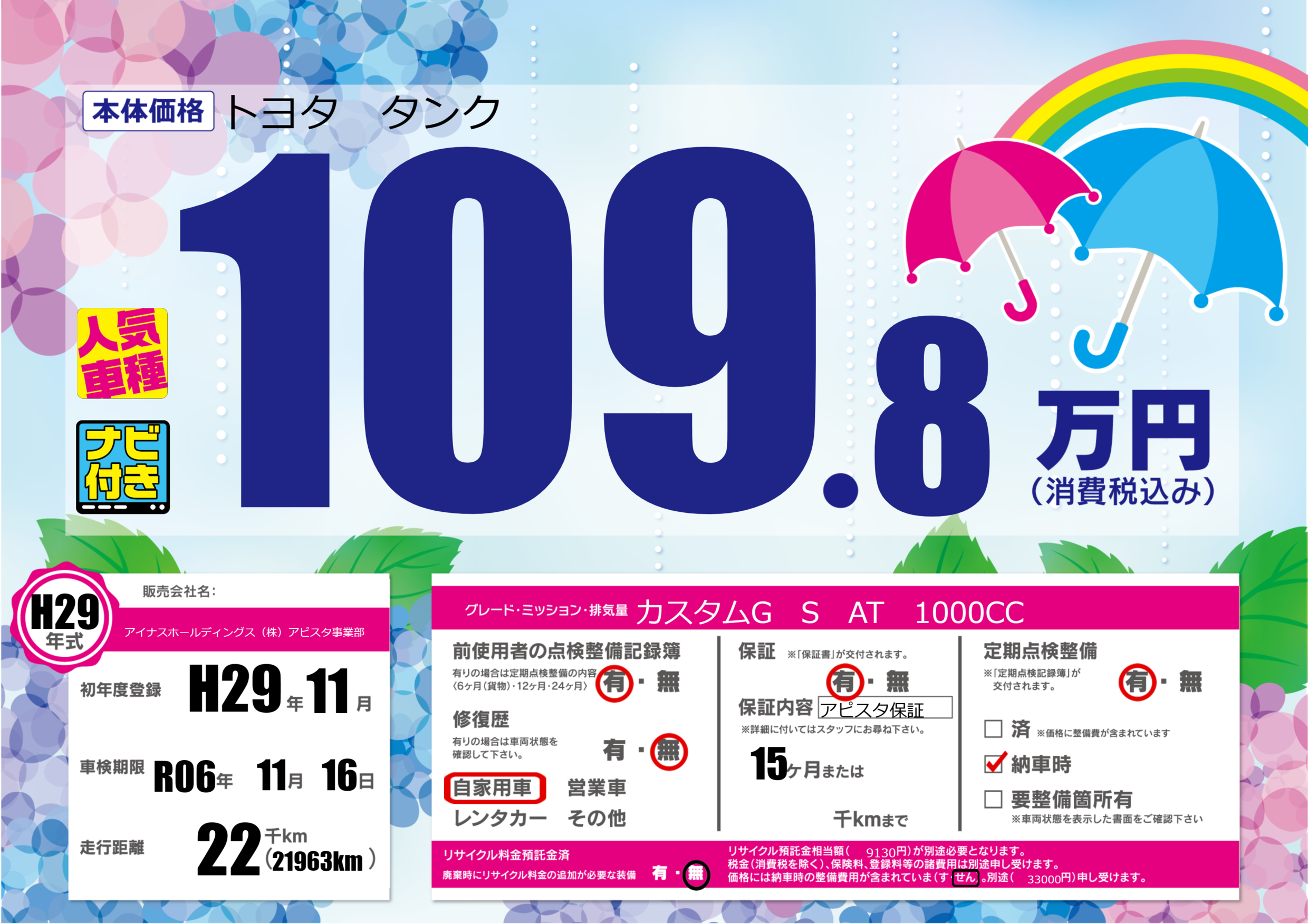 保証付き 保証内容(アピスタ保証) 15ヶ月または()千kmまで |