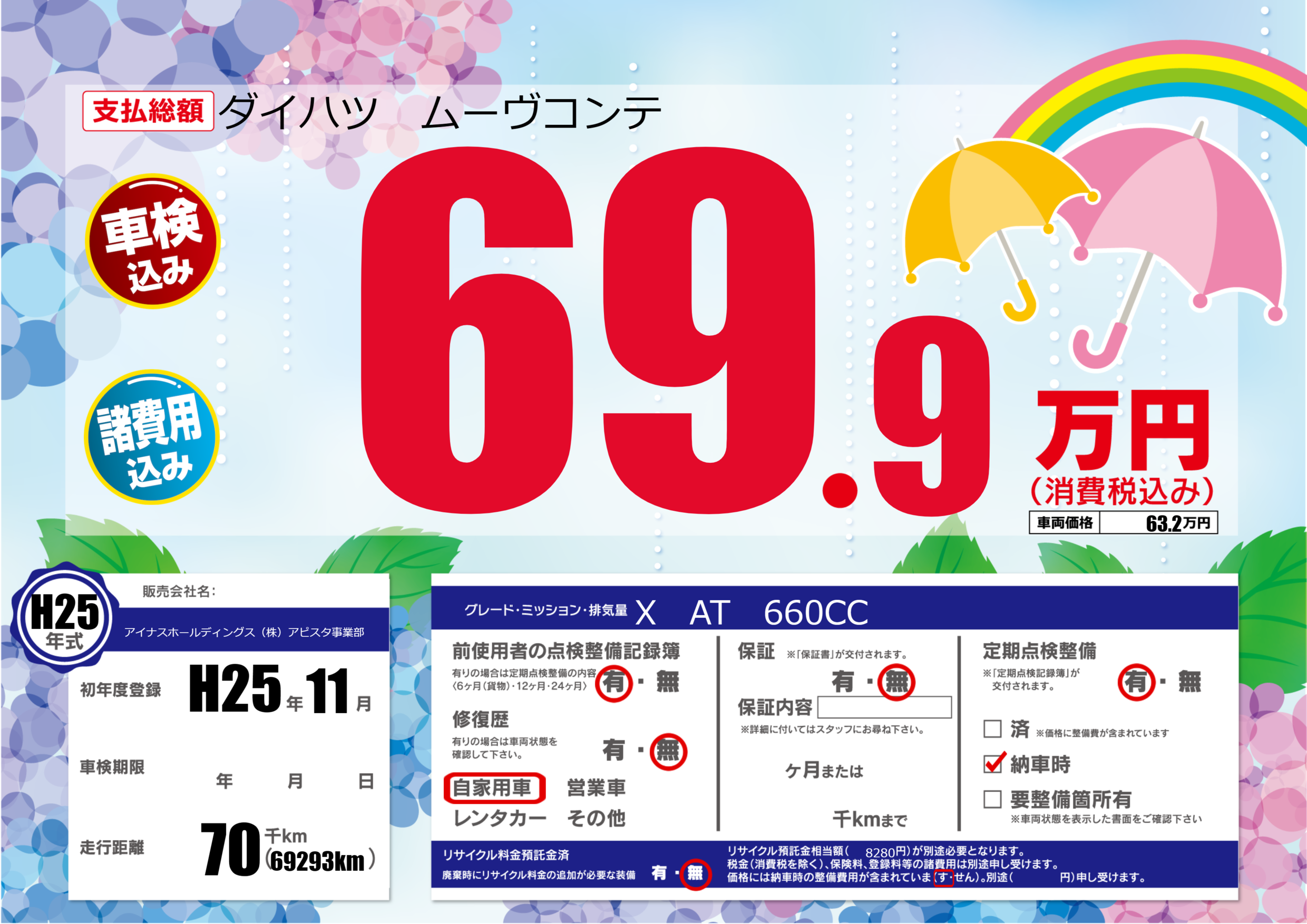 | 定期点検整備 | 定期点検整備あり 納車時あり | ||
