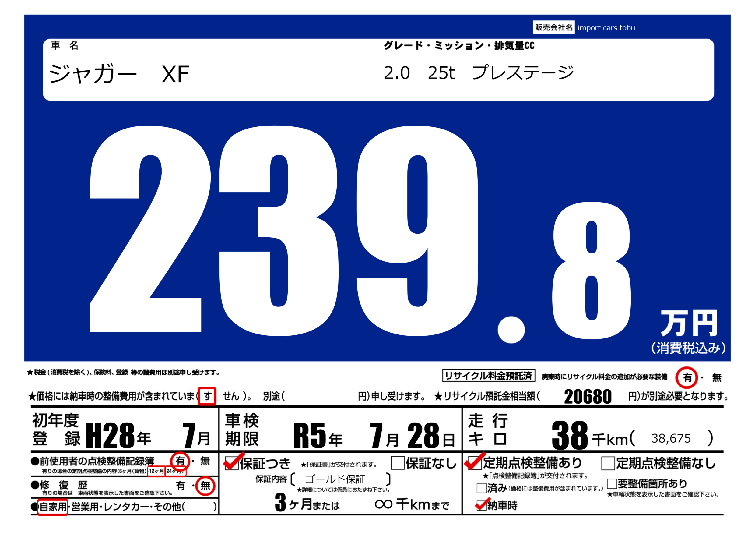 | 車名 | ジャガー XF | グレード ミッション 排気量 |
