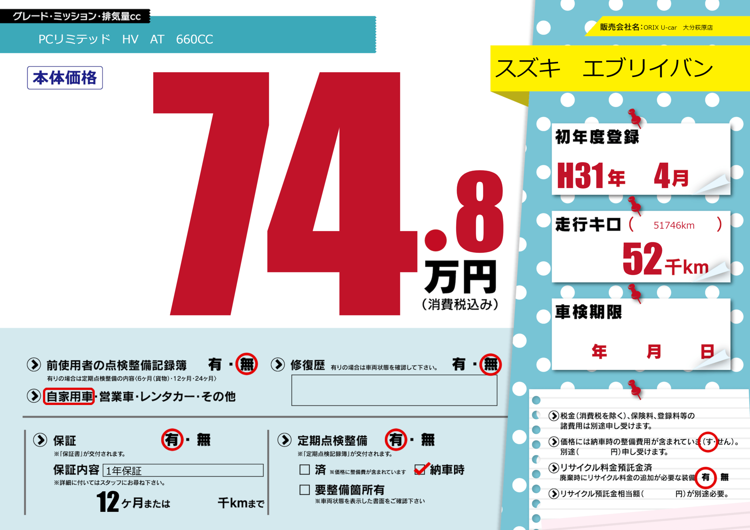 | 定期点検整備 | 定期点検整備あり 納車時あり | ||