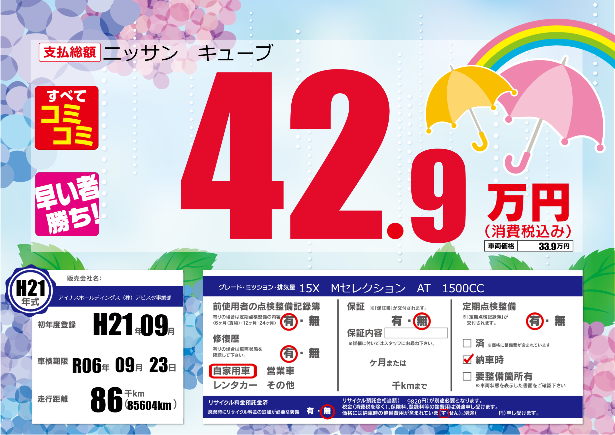 | 車名 | ニッサン キューブ | グレード ミッション 排気量 |
