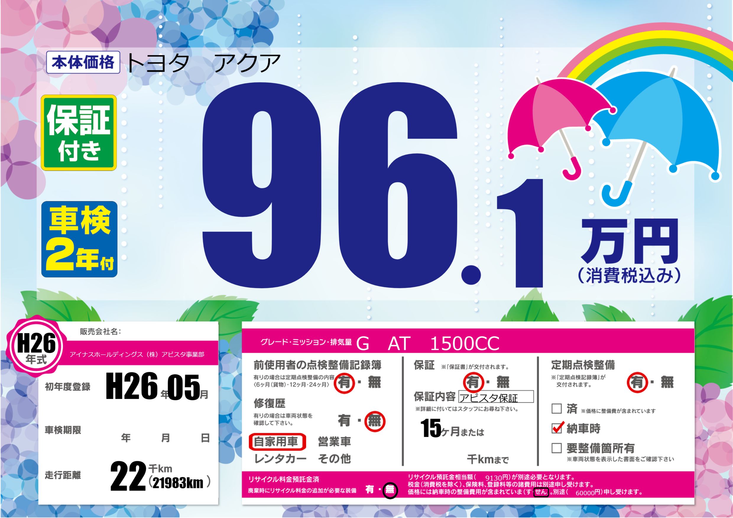保証付き 保証内容(アピスタ保証) 15ヶ月または()千kmまで |