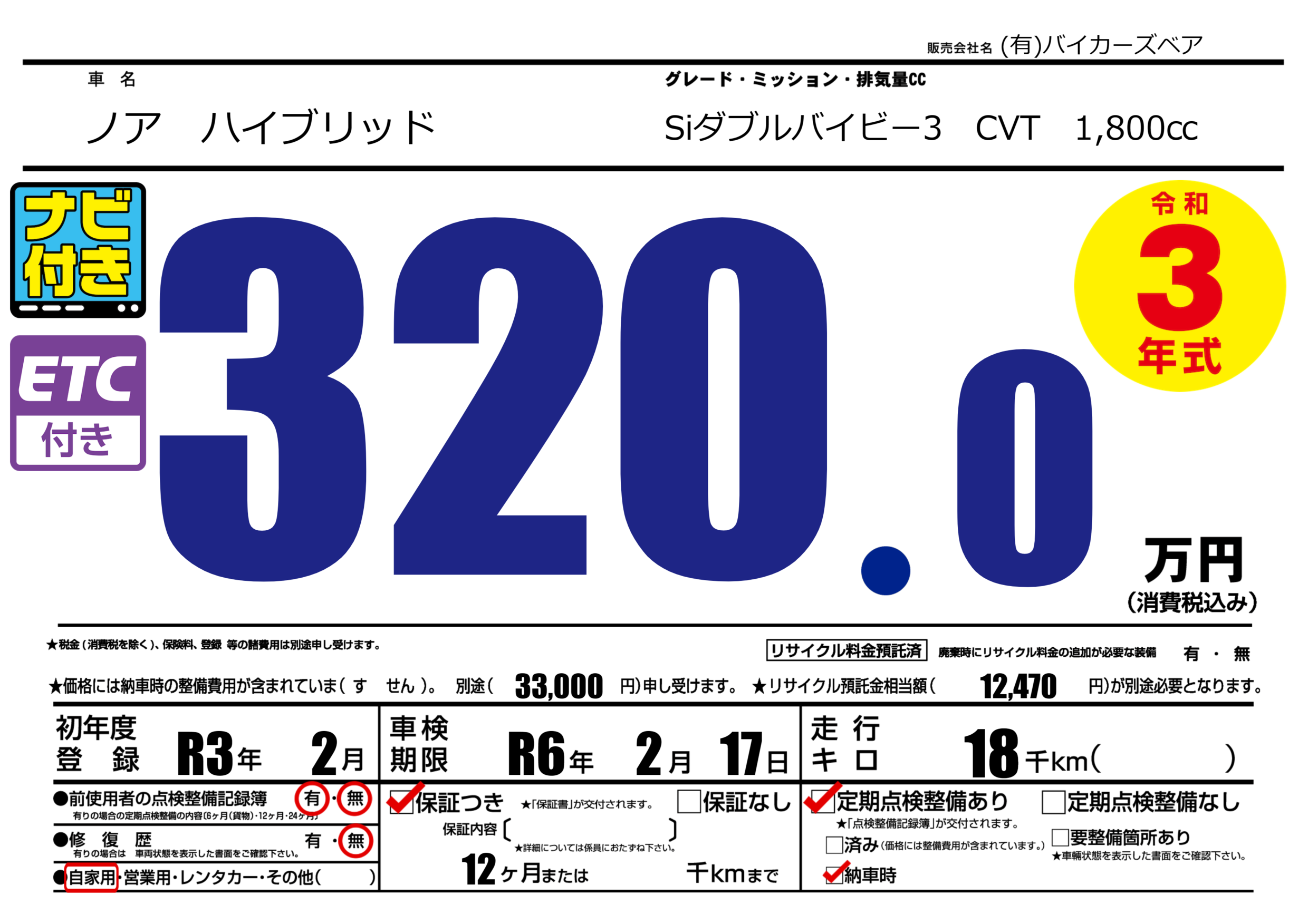 | 車名 | ノア ハイブリッド | グレード ミッション 排気量 |