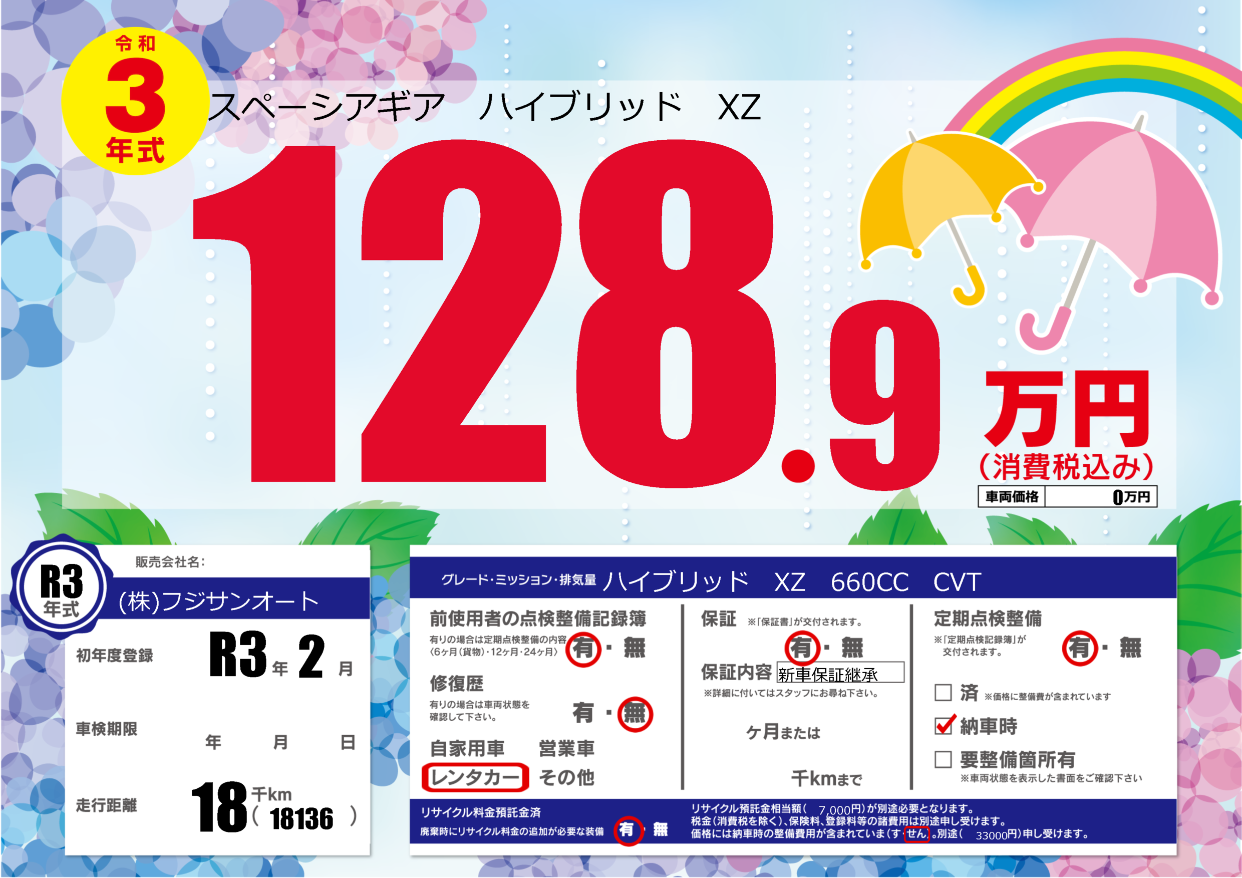 | 車名 | スペーシアギア ハイブリッド XZ | グレード ミッション 排気量 |