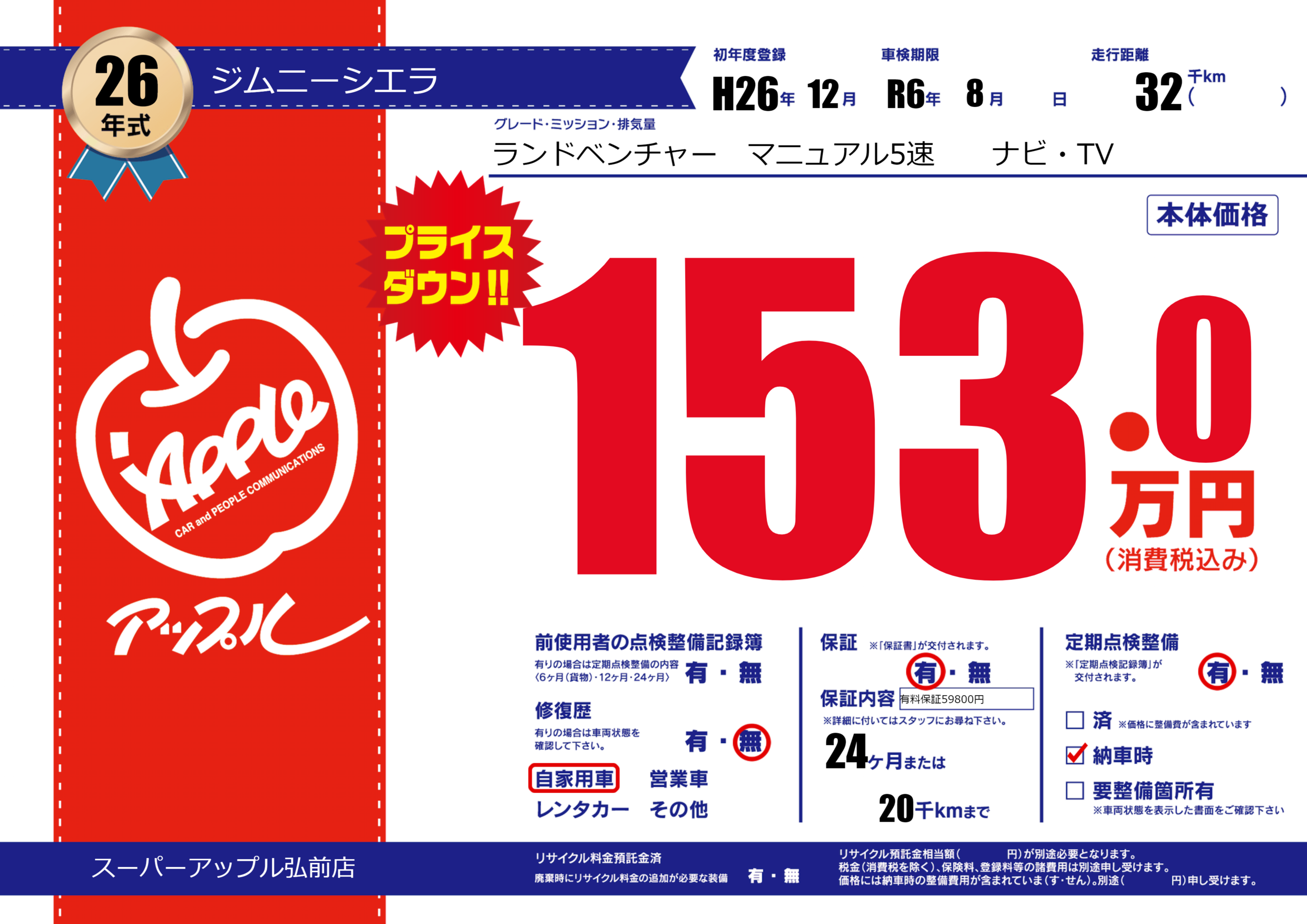 | 走行キロ | 3.2万km | 初年度登録 | H26年12月 |