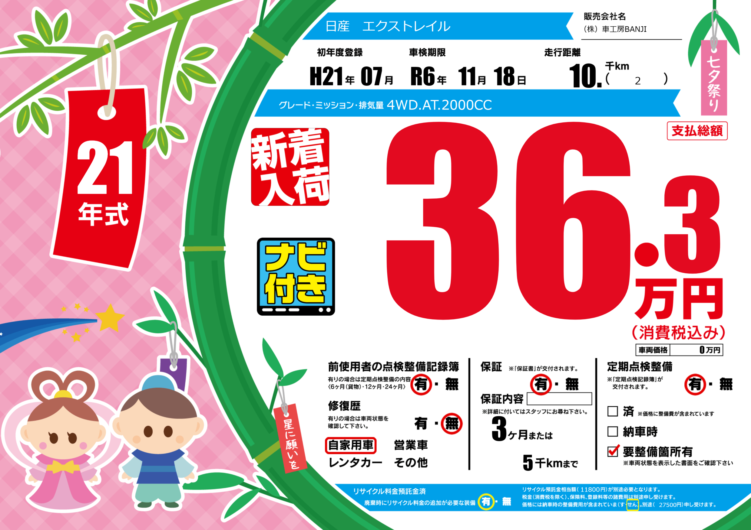 | 車名 | 日産 エクストレイル | グレード ミッション 排気量 |