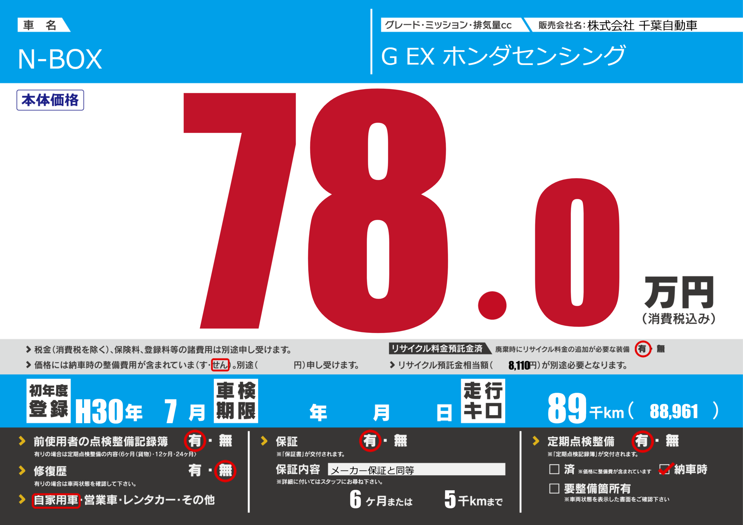 | 車名 | N-BOX | グレード ミッション 排気量 |