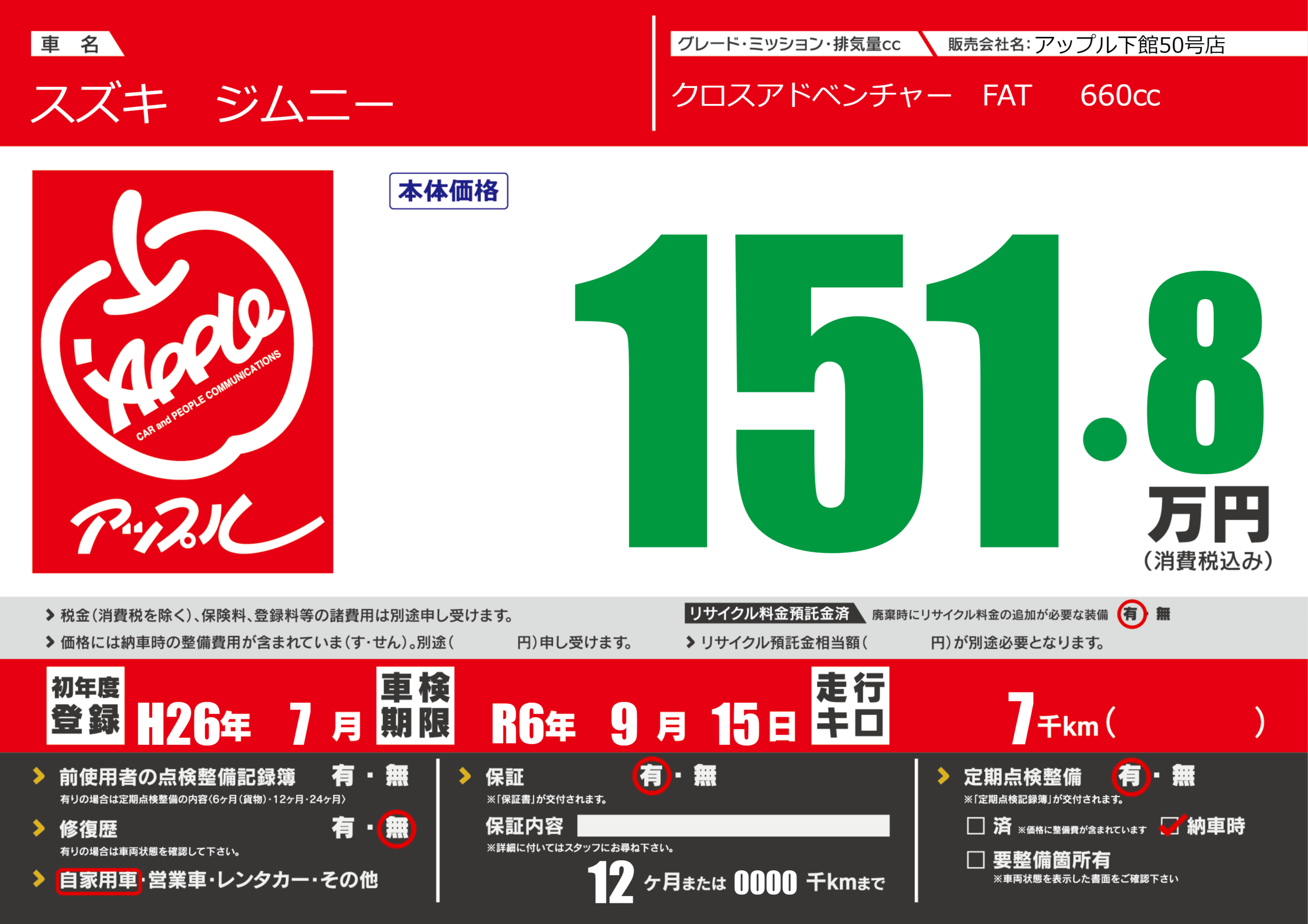 保証付き 保証内容(---) 12ヶ月または(0000)千kmまで |