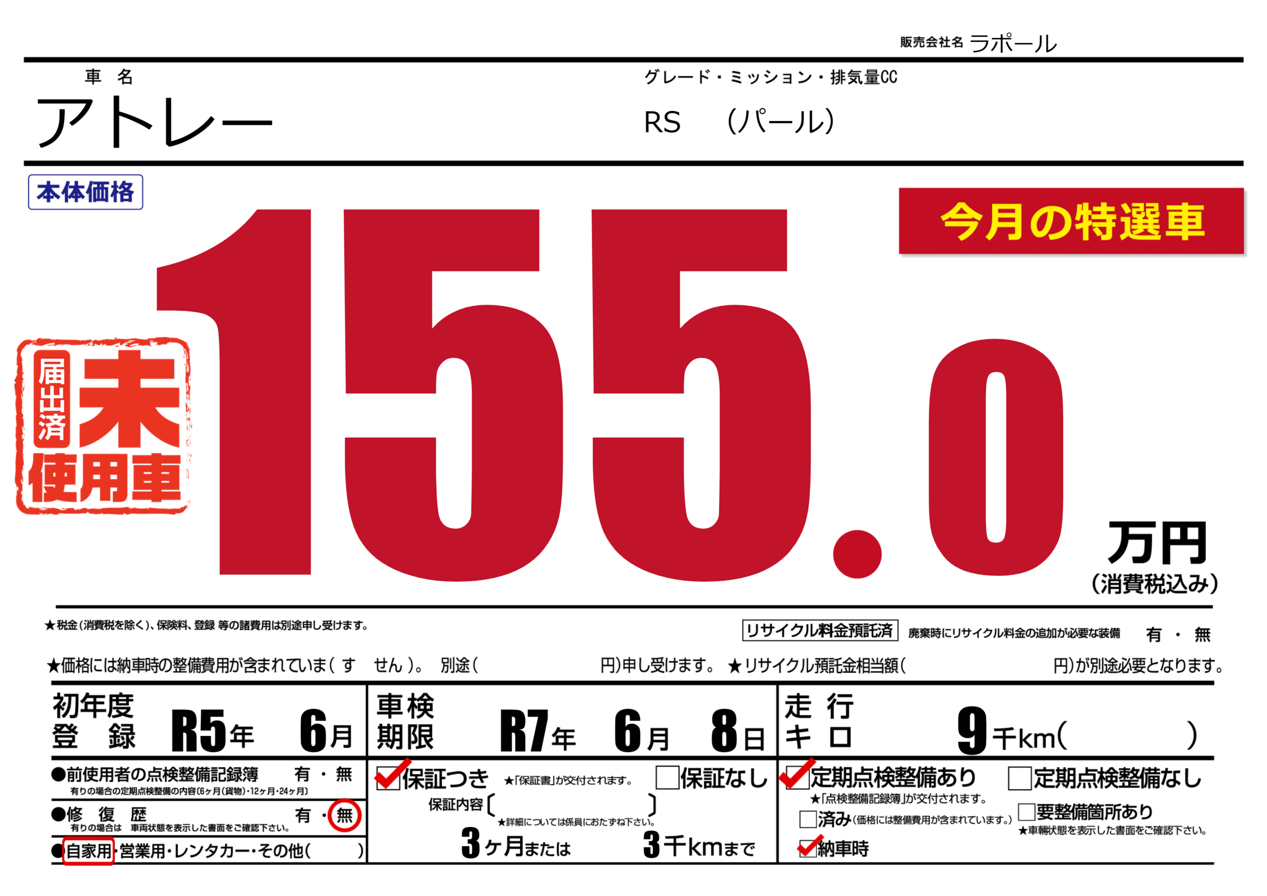 | 走行キロ | 0.9万km | 初年度登録 | R5年6月 |