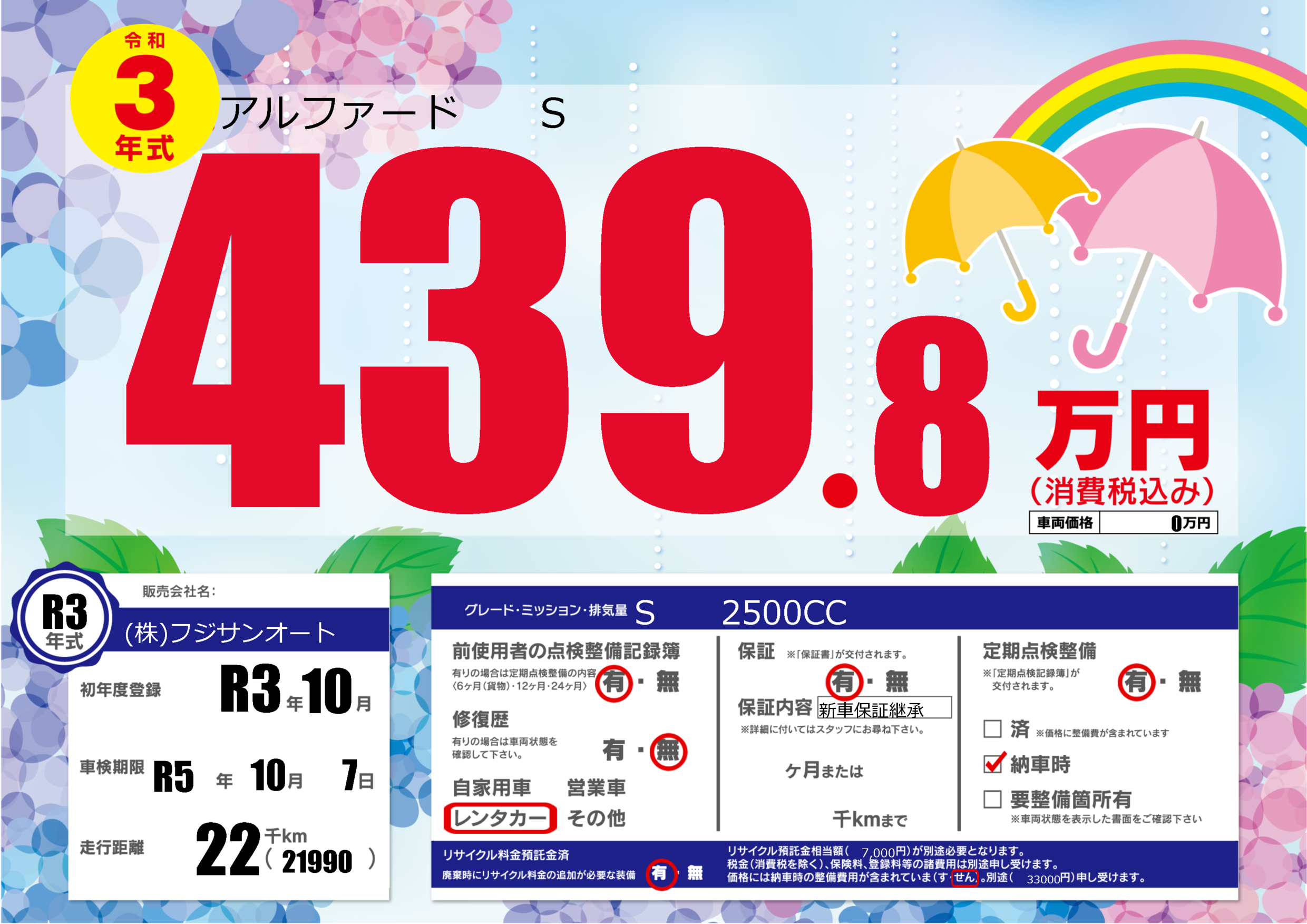 | 車名 | アルファード S | グレード ミッション 排気量 |