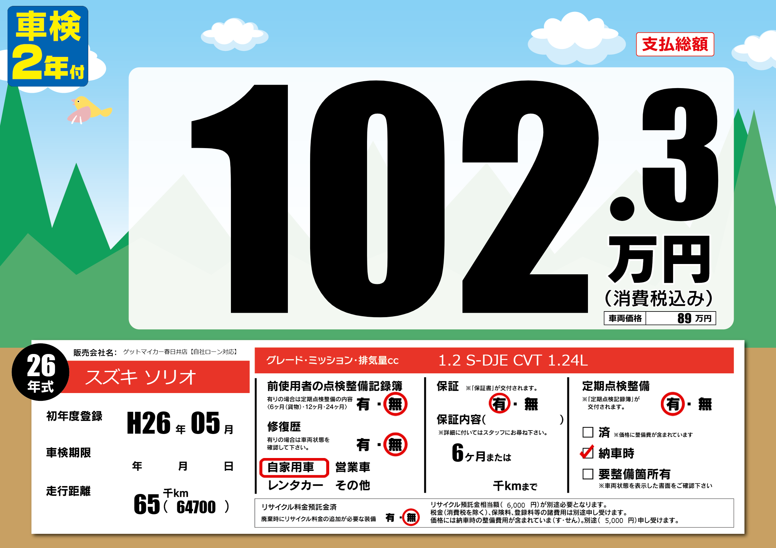 | 車名 | スズキ ソリオ | グレード ミッション 排気量 |
