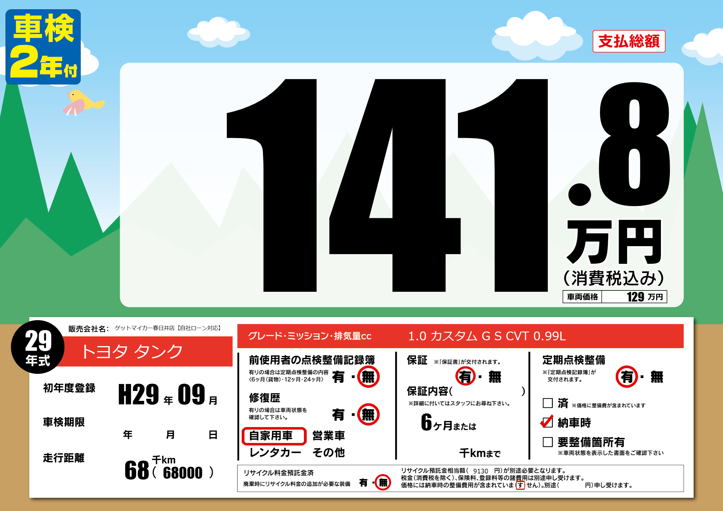 | 車名 | トヨタ タンク | グレード ミッション 排気量 |